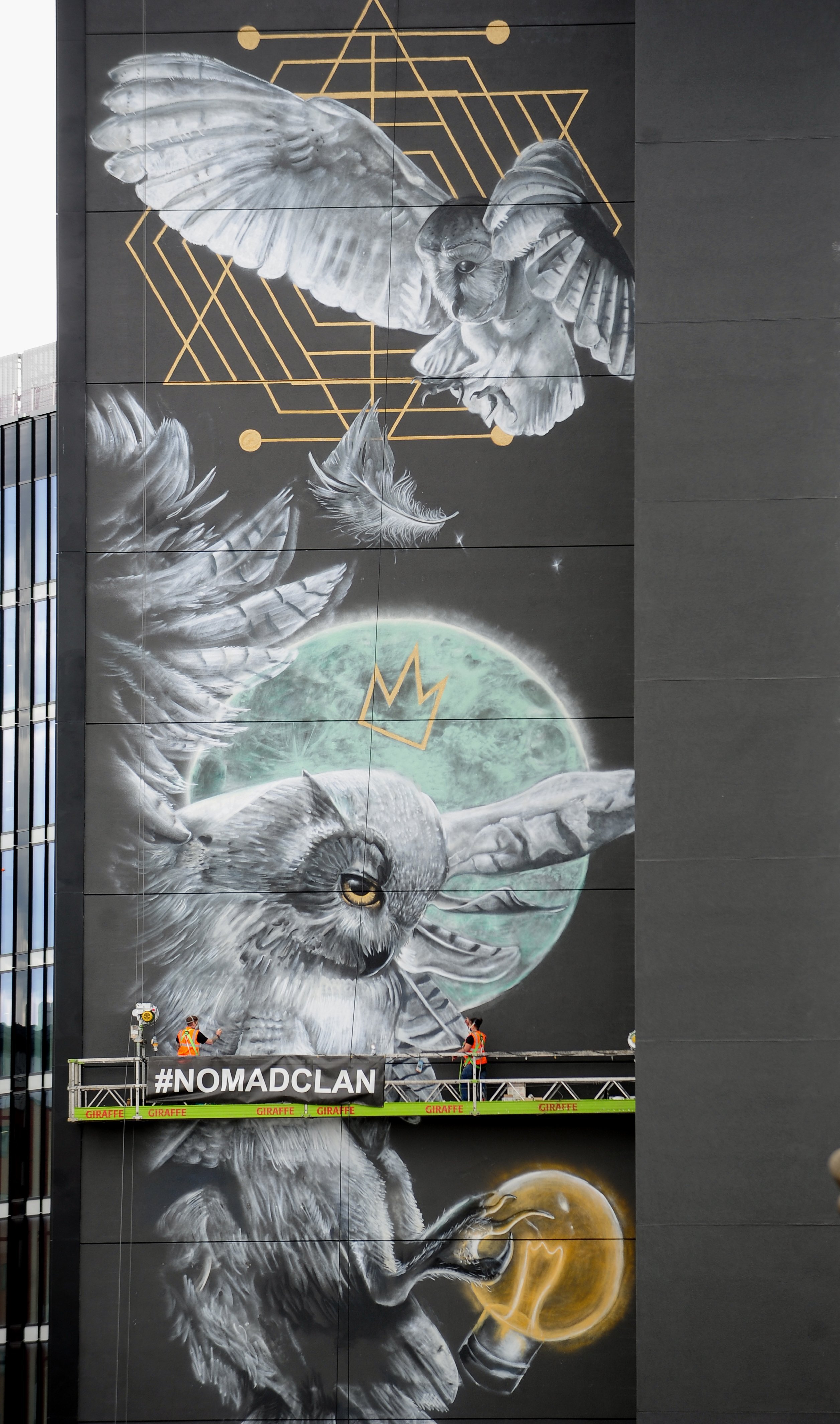 Together, they have transformed the full length of the east face of the Platform building, formerly City House, into a spectacular image of an owl in flight alongside the moon and a crown.