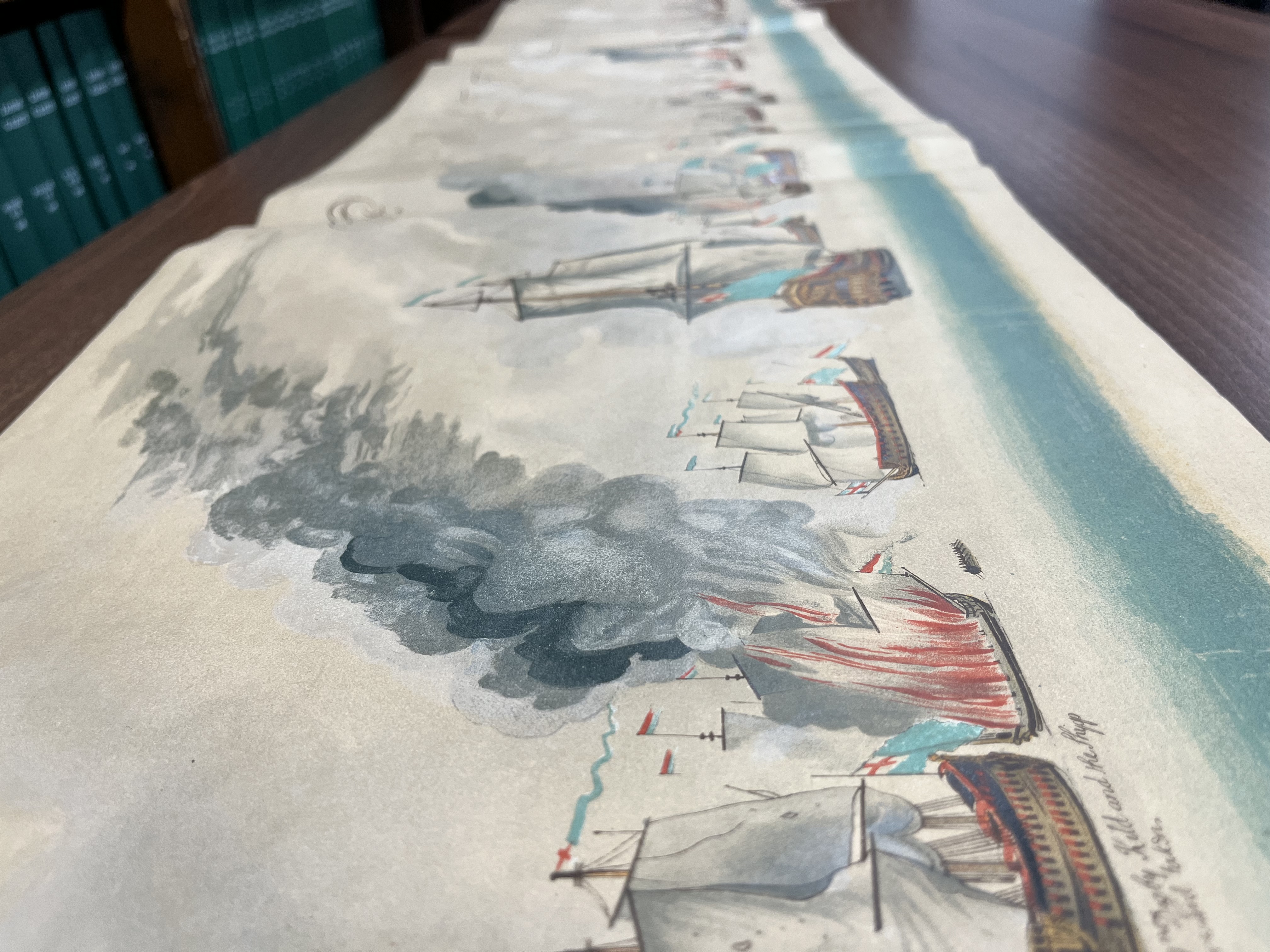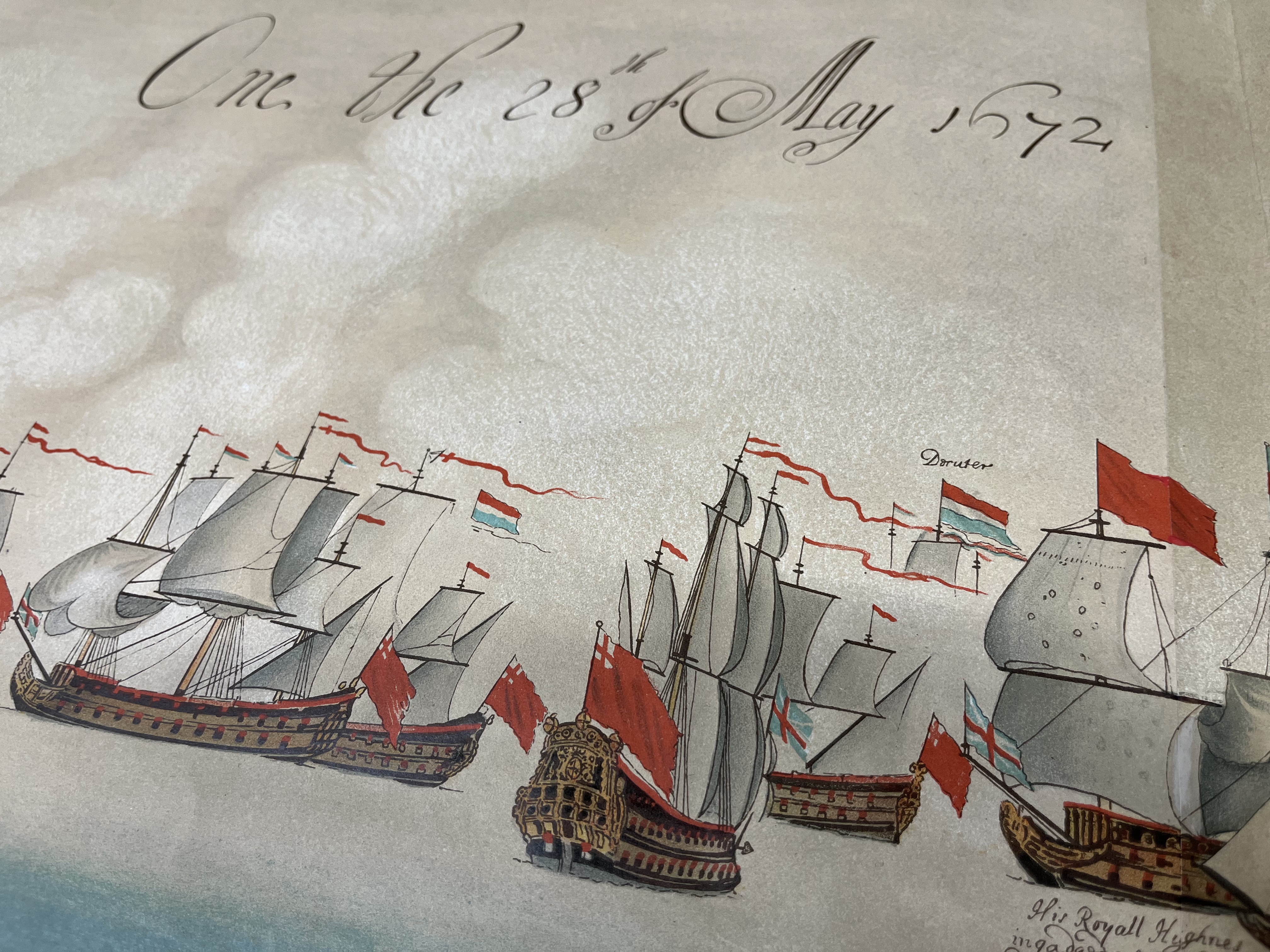 The step-by-step, illustrated account, estimated to be more than 50 feet in length, documents every cannon blast and flaming sail from the pivotal battles of Solebay and Texel which took place in the 1670s.