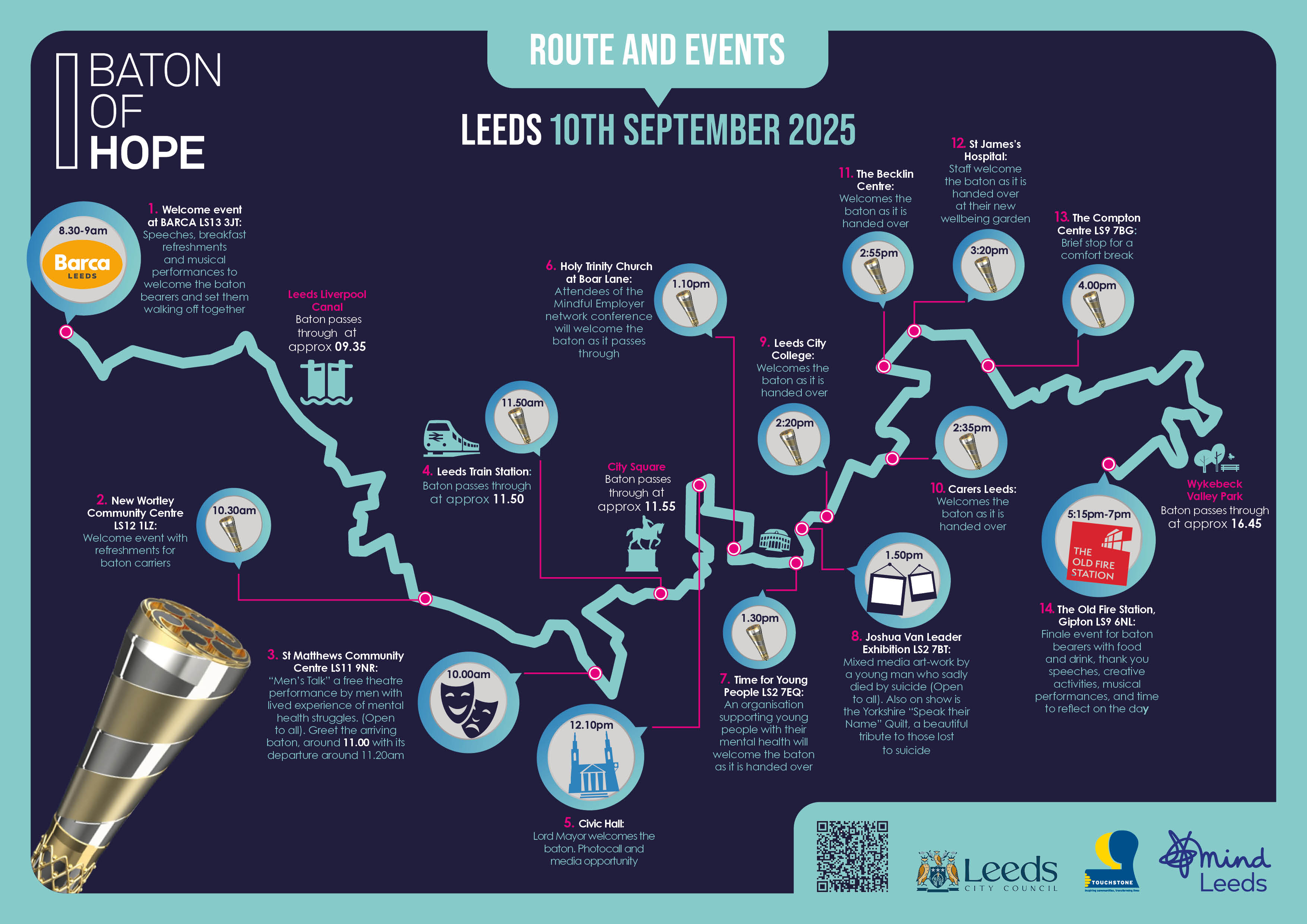 Full details of the Baton of Hope tour in Leeds including a downloadable version of the route, and associated events, can be at https://www.mindwell-leeds.org.uk/baton-of-hope-leeds-2025.