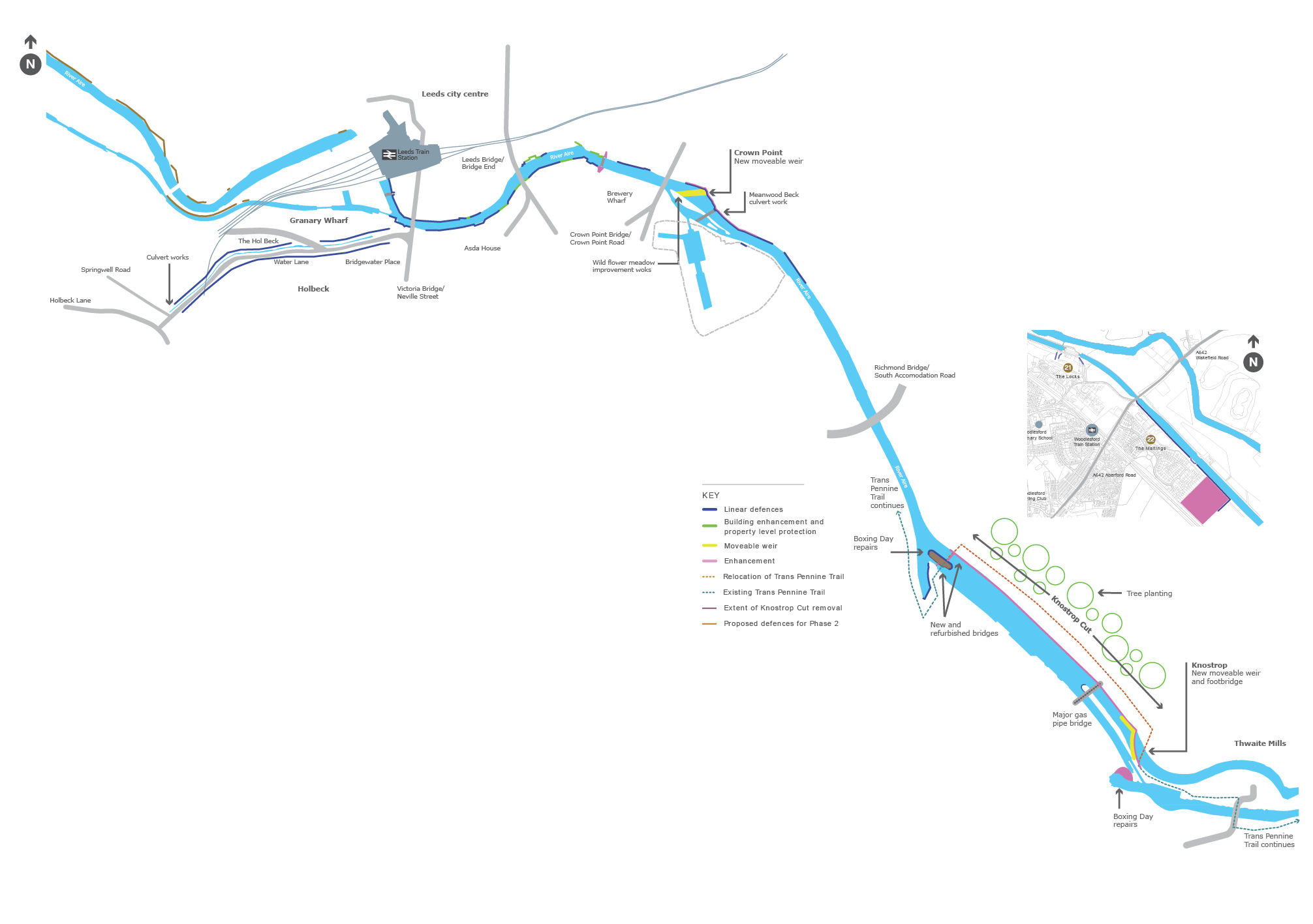 The Leeds Flood Alleviation Scheme has been carried out in two phases. The first phase, completed in 2017, saw the creation of new moveable weir gates across the river at Crown Point and Knostrop together with merging work to the river and canal at Knostrop supported by new flood walls and embankments covering 4.5kilometres through Leeds city centre and downstream to Woodlesford in keeping with the surrounding areas. The use of moveable weirs able to be raised and lowered to control river levels was the first time such technology had been used for flood defences in this way anywhere in the UK.