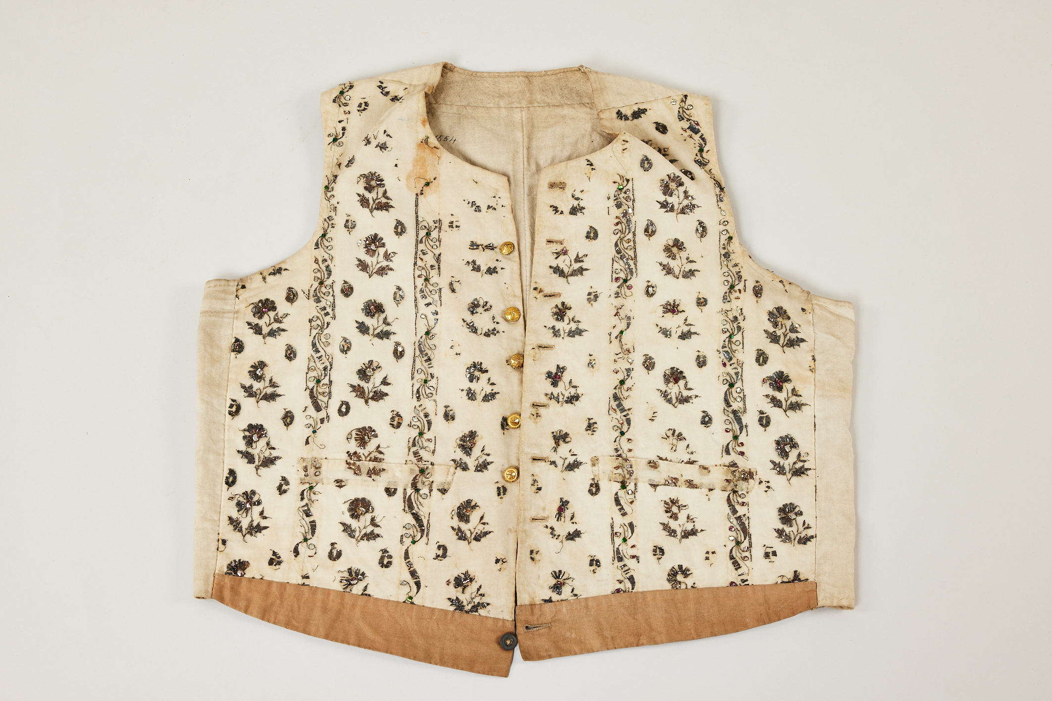 Objects on display include a muslin dress fashioned in the early 1800s. Made of Indian muslin, the dress features a European trademark, illustrating how cotton harvested in India was exported and used by European dressmakers and tailors.