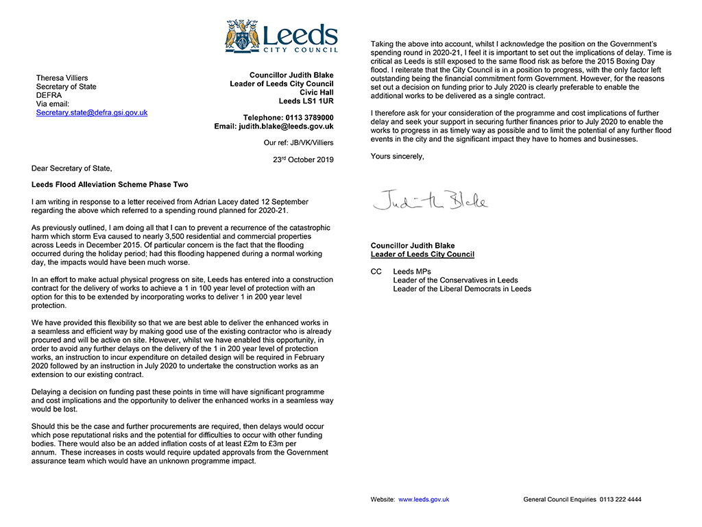 The Leader of Leeds City Council Councillor Judith Blake has written to the government this week expressing the need for a decision to be made over the remaining funding for the next phase of the Leeds Flood Alleviation Scheme.
