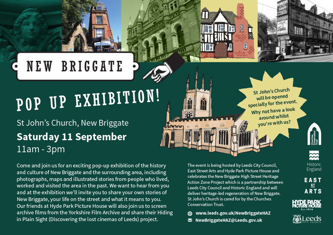 The HAZ project will deliver heritage-led regeneration of New Briggate using government-funded grants for repair work to buildings and public spaces. The council is also working with East Street Arts and other organisations such as Leeds Heritage Theatres, Opera North, North Bar, Age UK, Leeds Civic Trust and the Churches Conservation Trust on a tie-in programme of community engagement and cultural events that will celebrate the history of New Briggate. Stories shared by people attending the pop-up exhibition will feed into this wider work.