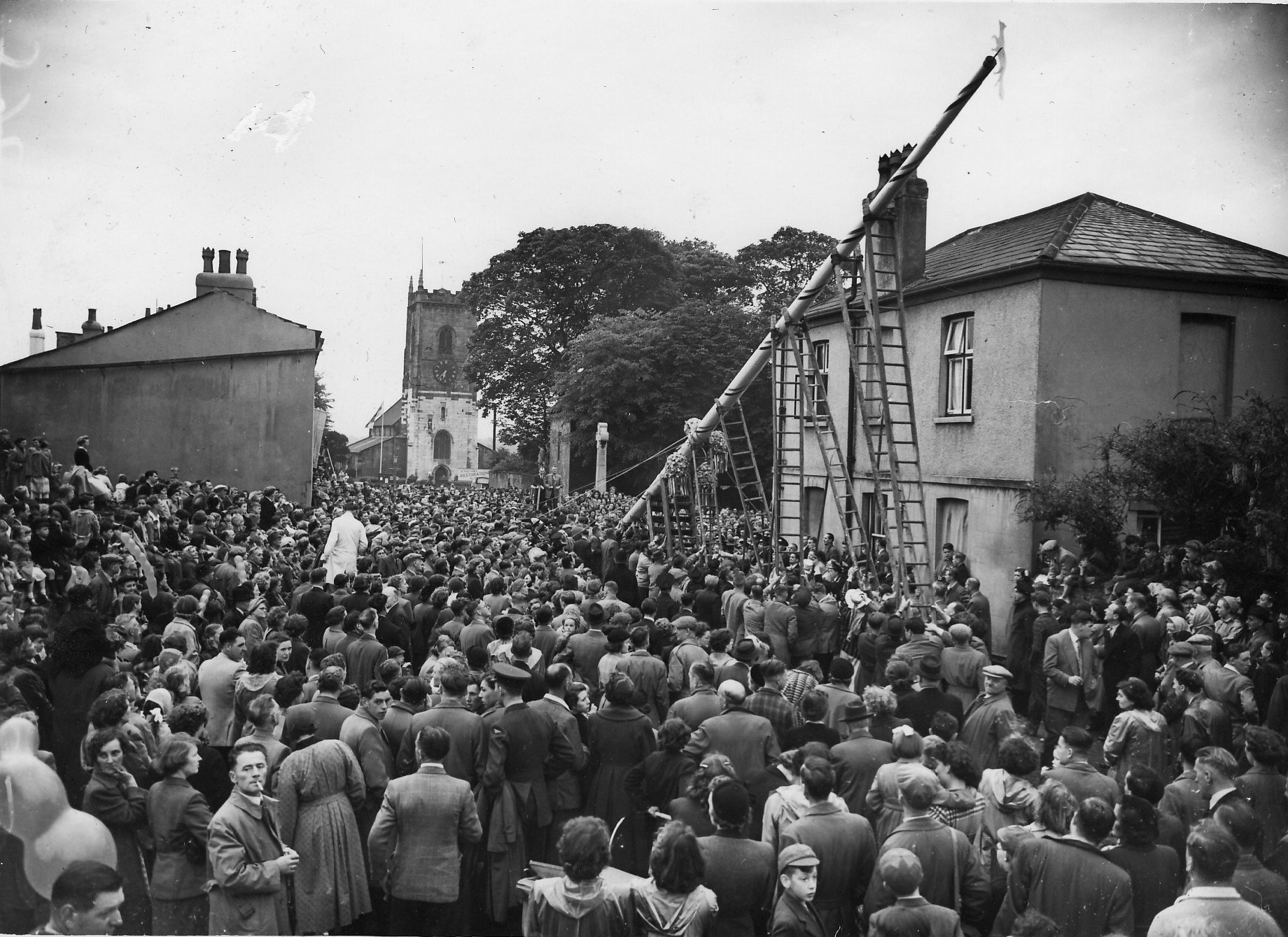 - An image of the much-loved Barwick Maypole being put up using ropes and ladders in 1954, courtesy of Barwick in Elmet Historical Society.