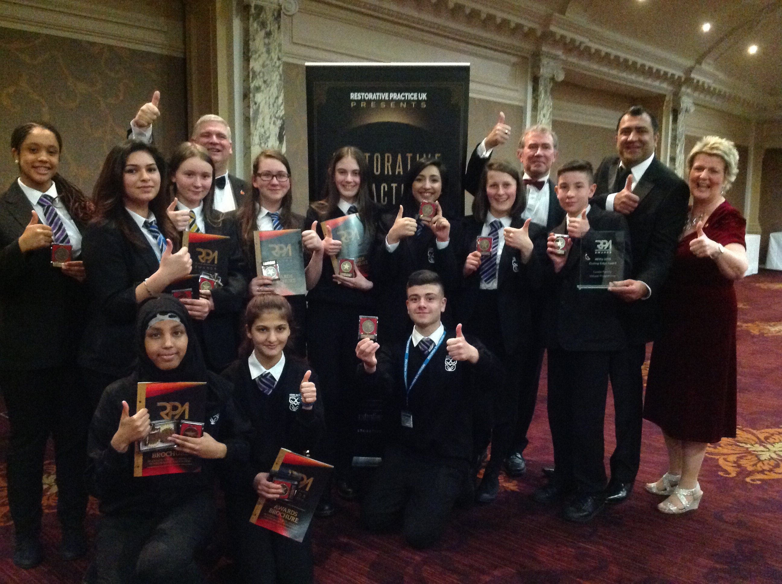 The photograph shows Carr Manor pupils at the Restorative Practice UK Awards with Andy Lloyd, Nigel Richardson, Sue Rumbold and Saleem Tariq from Leeds City Council’s children’s services.