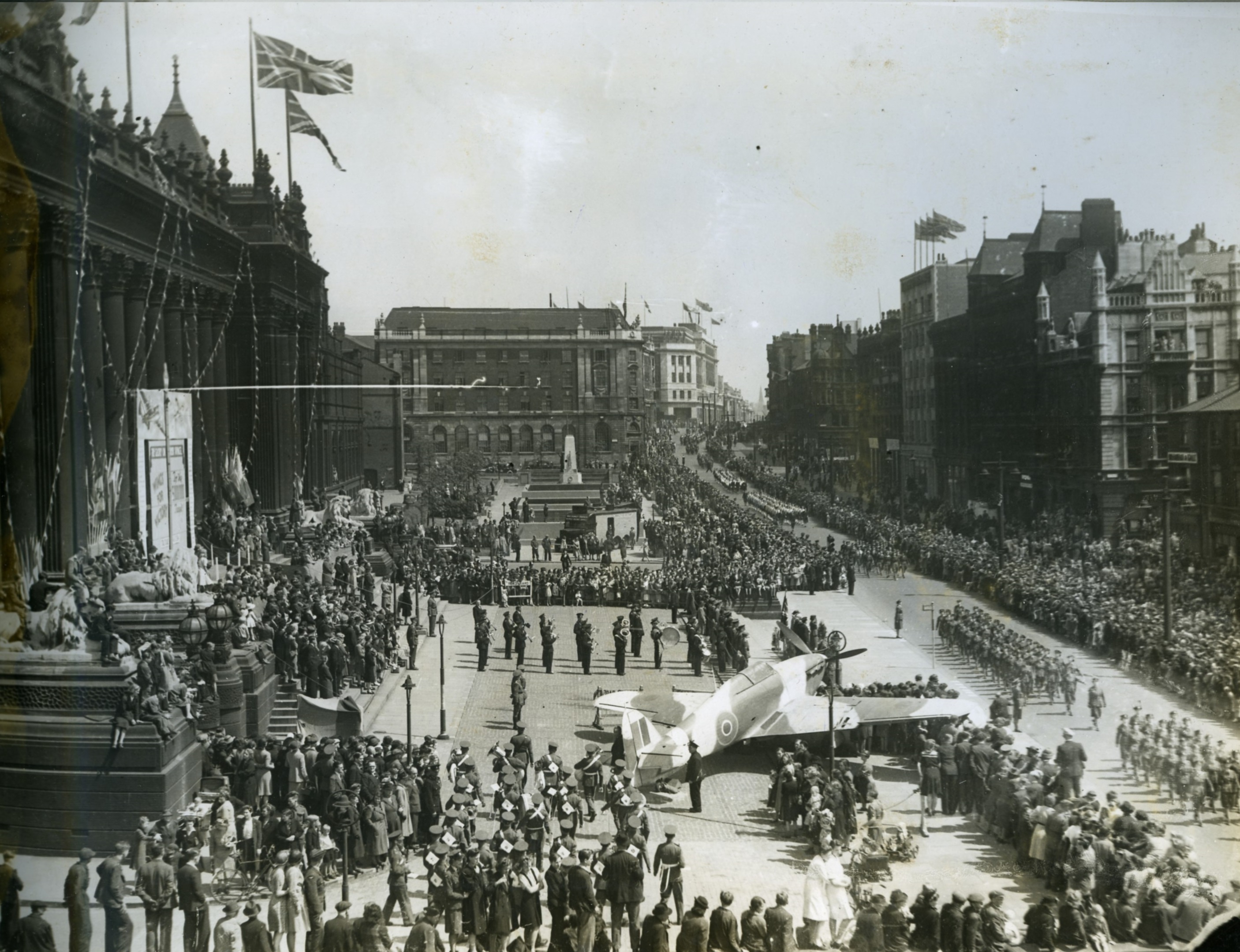 A spectacular parade marches down The Headrow as a military band plays in front of Leeds Town Hall and a majestic Second World War fighter plane wows the excited crowd of thousands.