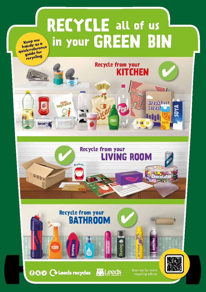 The leaflet also includes a handy guide showing the many household items that can go into your green bin for recycling – including the extra cardboard packaging, metal drink cans and chocolate boxes that this time of the year brings.