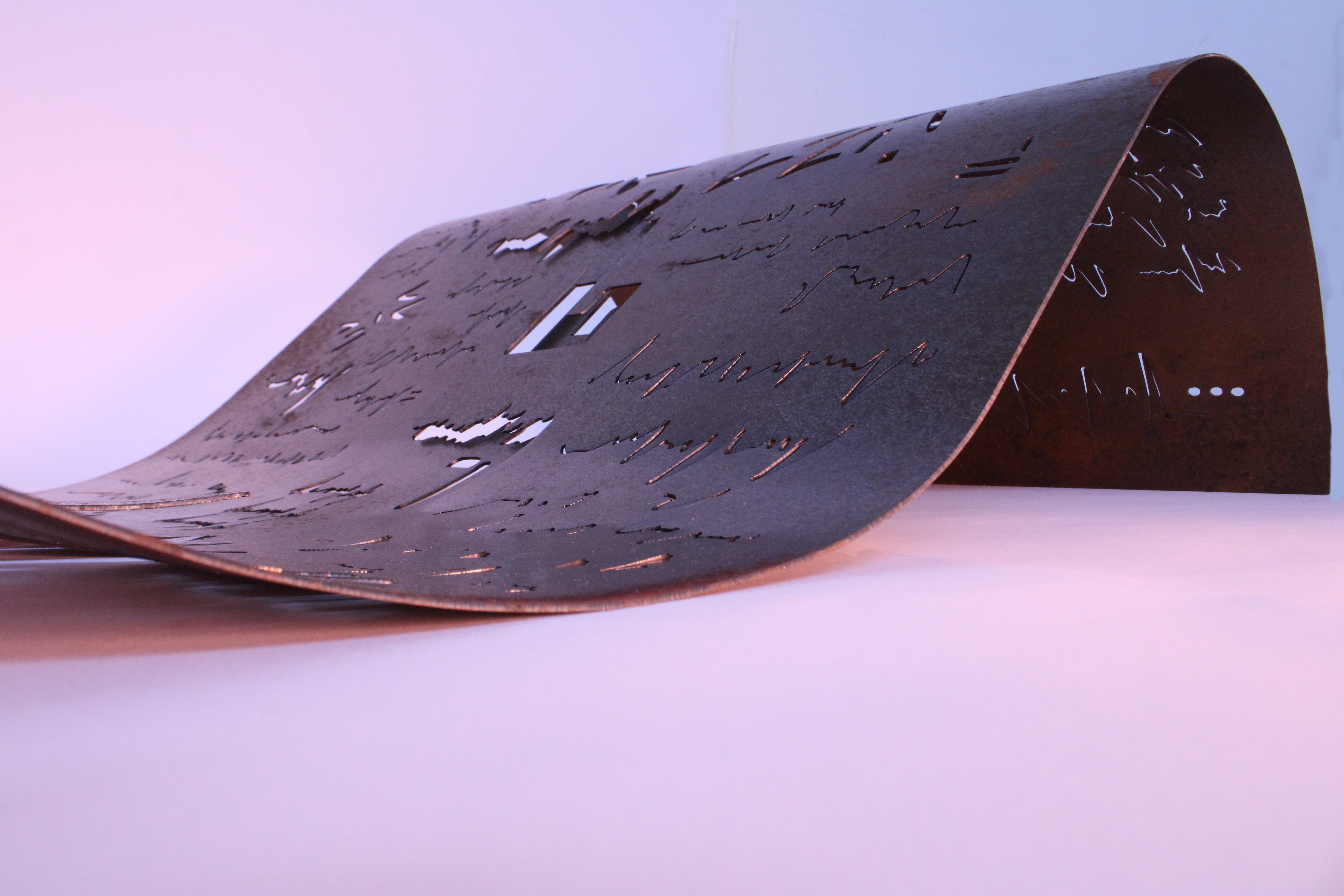 The work of Elrick Boldy (Leeds Arts University) explores the limits of communication through asemic writing – drawings symbolic of writing are rendered using plasma-cut steel, which is formed into curves and waves, then treated with rust-adjacent patina.