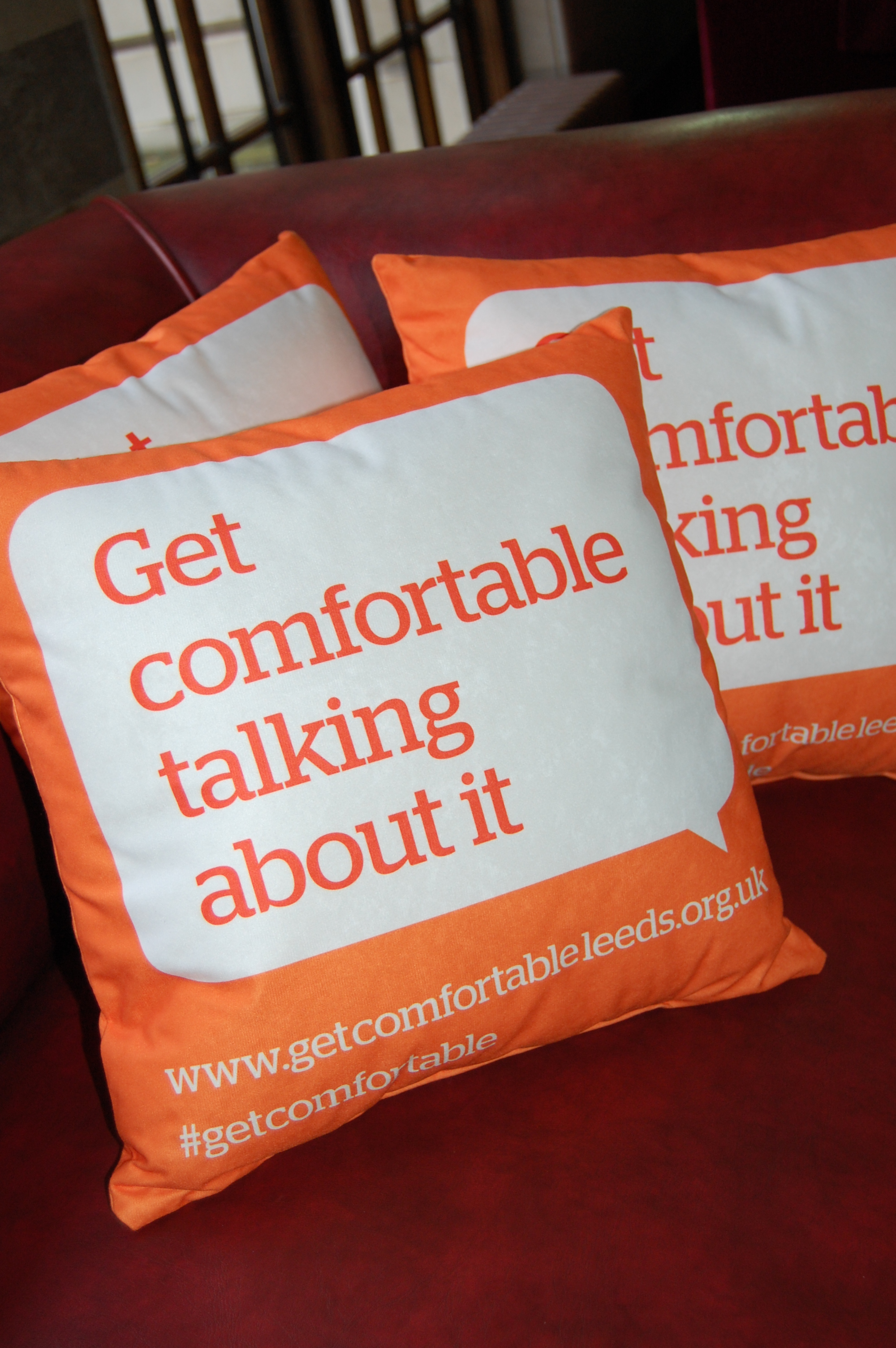 ‘Get comfortable talking about it’ cushions can be found across the city on seats in local one stop centres, community hubs, children’s centres, leisure centres, some GP practices, across the city centre, and even on park benches. As well as the cushions campaign, sofas are placed in key locations across the city including the community hubs and Leeds city centre, to help visitors to ‘get comfortable’ and talk about domestic violence.