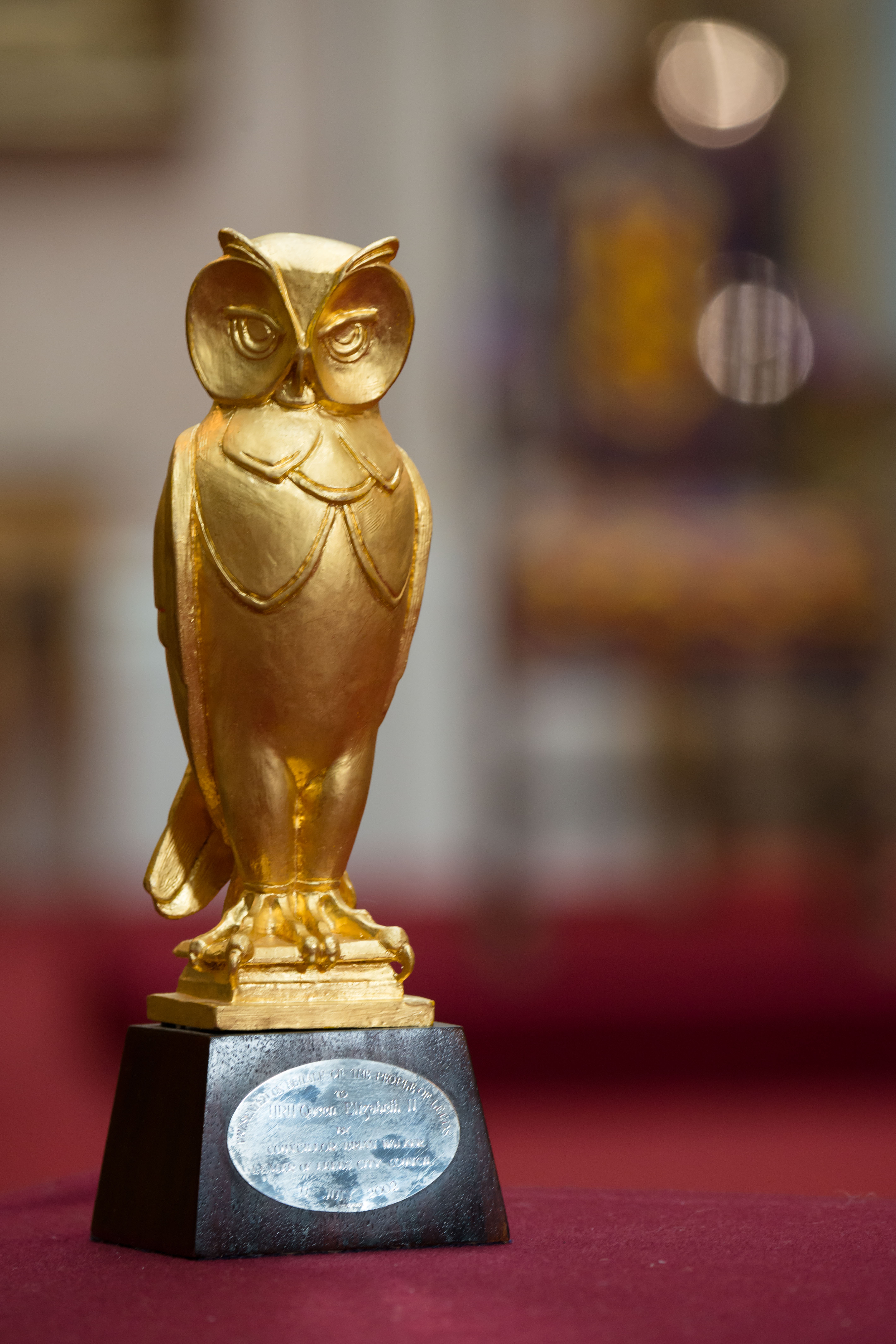 Curated by the Royal Collection Trust, the Buckingham Palace Royal Gifts exhibition displays a range of offerings given to Her Majesty during the past 65 years. To view the gilt model owl presented to Her Majesty The Queen in the council chamber of Leeds Civic Hall, please see: https://www.royalcollection.org.uk/collection/200091/owl