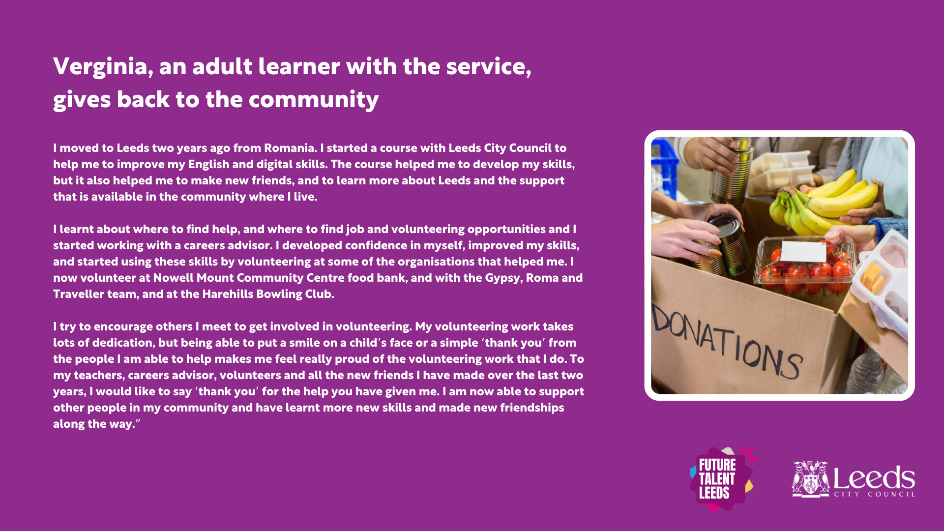 One of those who has successfully benefitted from adult learning through the programme is Verginia Lazarencu, who now volunteers at a food bank in Leeds.