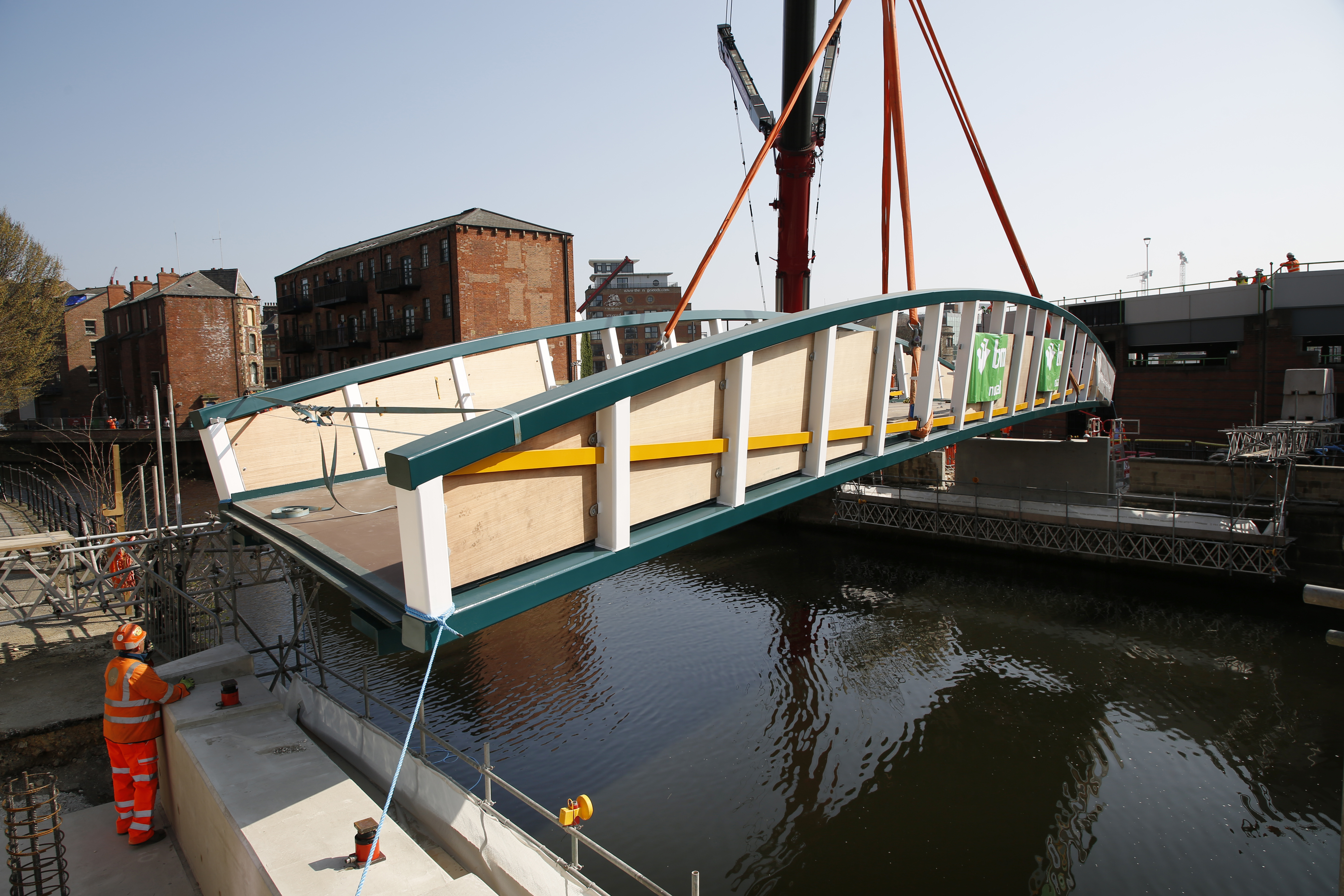 A striking new bridge dedicated to the memory of a man who died after being racially harassed has been lowered into place across the River Aire in Leeds.