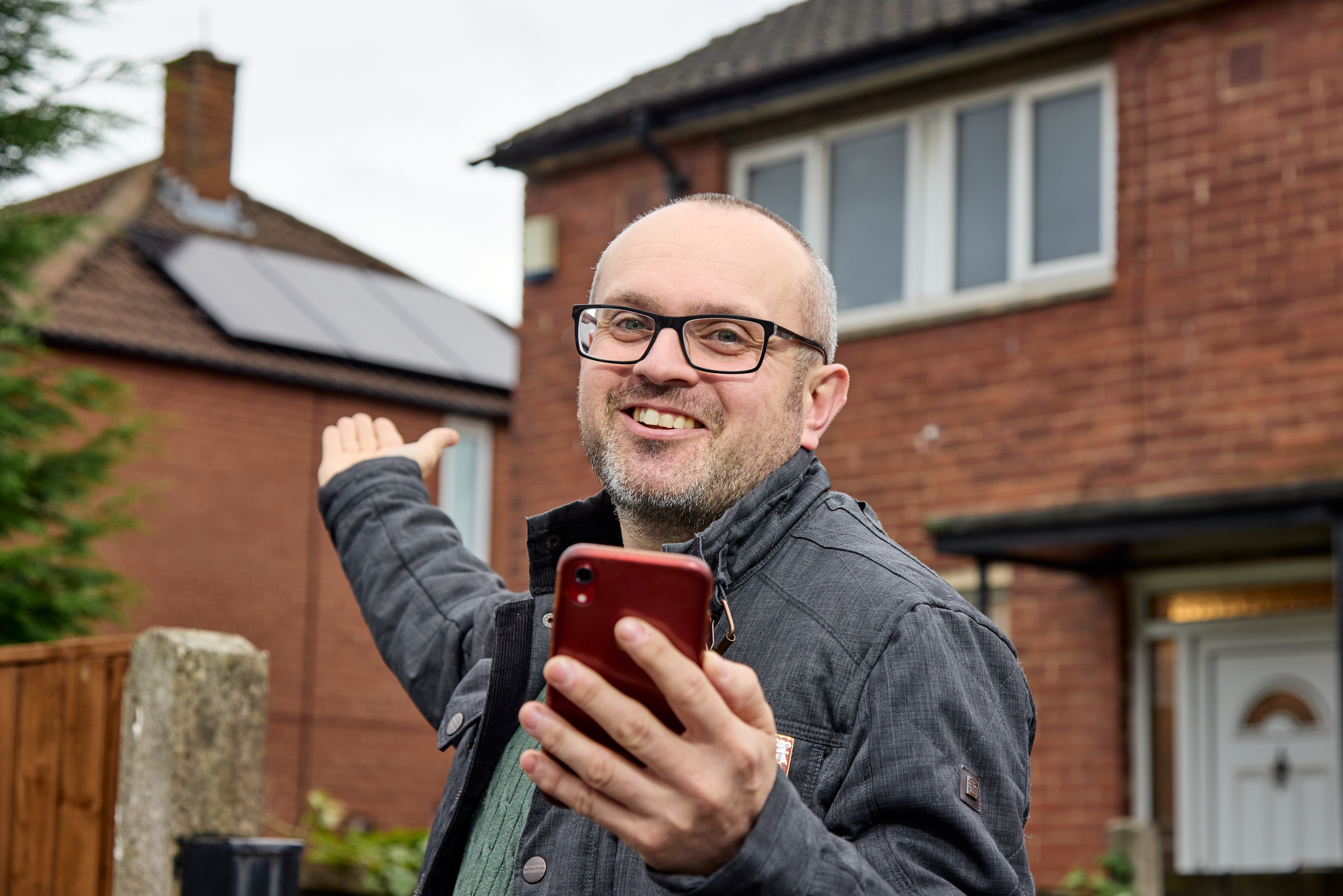 Morley resident Anthony Smith presenting his new solar panels while viewing how much electricity they are generating.
