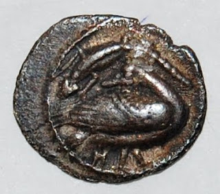 Known as a trihemiobol, the coin carries a design which depicts a goose turning its neck round so it can look at the salamander and the Greek letter Eta.