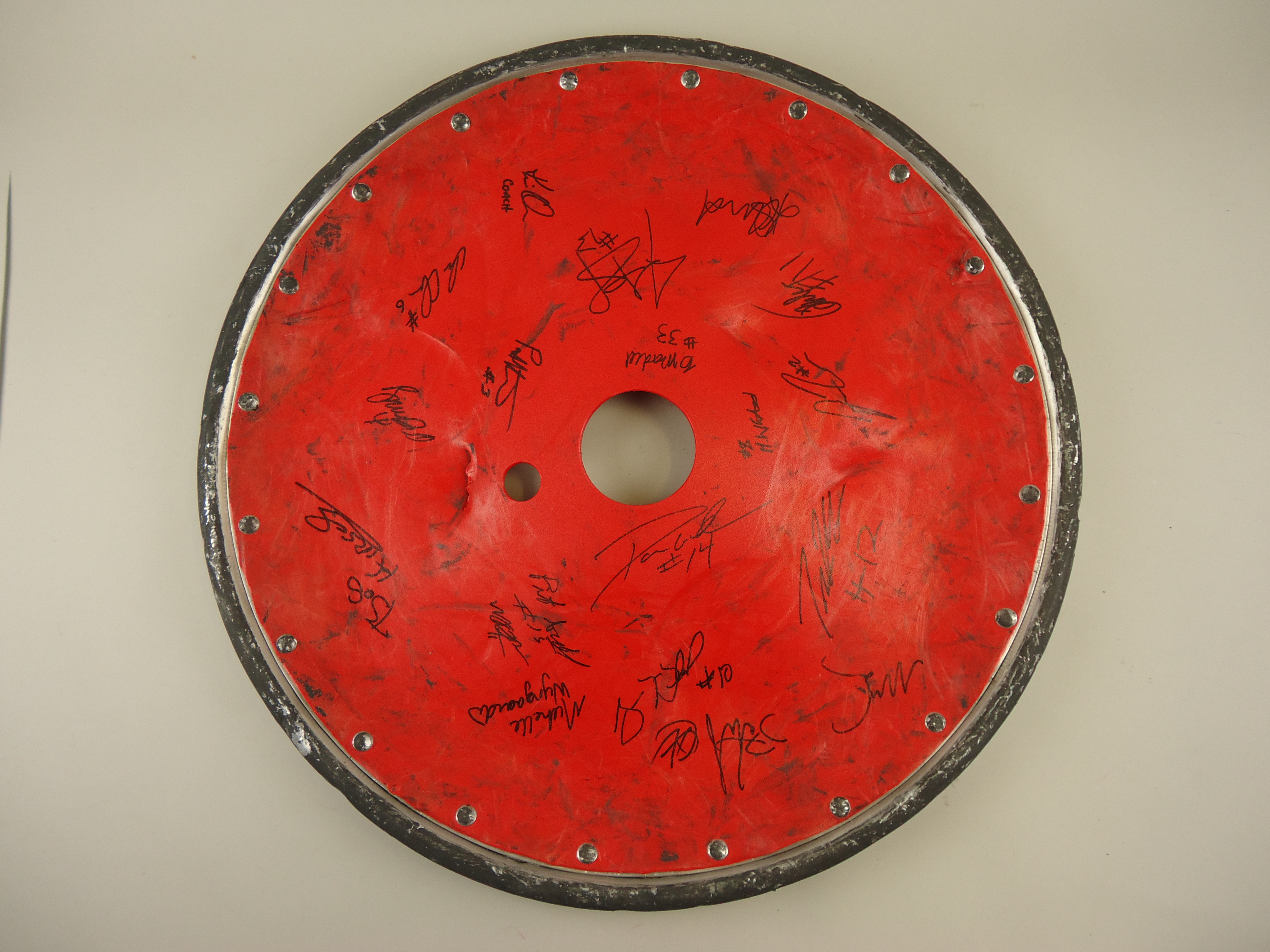 Originally used by team member Zak Mandell, the wheel guard is signed by all 18 members of the squad and still bears the scars of several high-impact clashes.