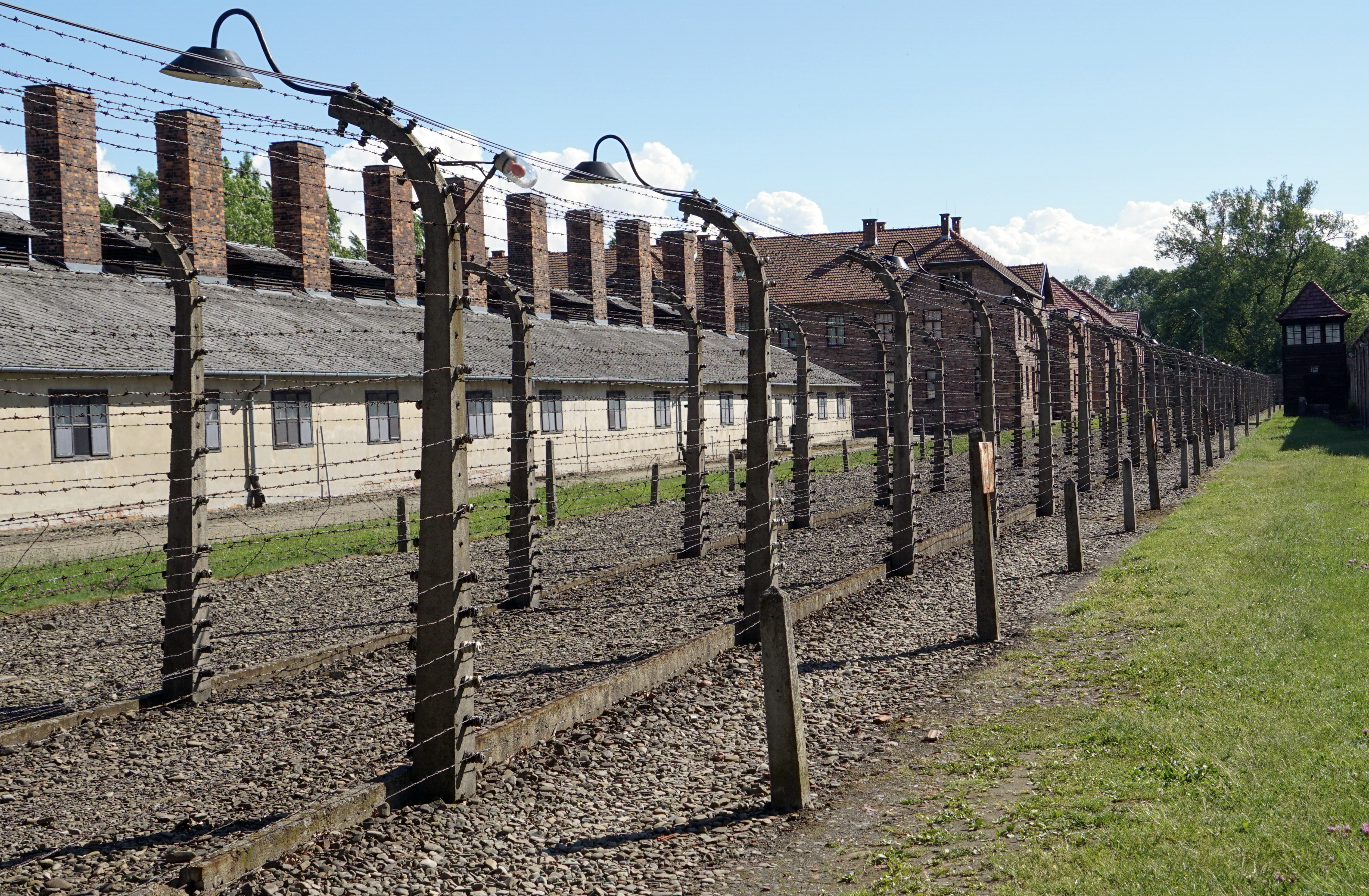 Photo Credit: Leeds City Council. Caption: Barbed wire fences and watch tower at the Auschwitz 1 camp.