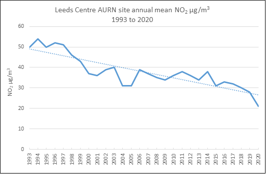 - Leeds has come a long way to improve air quality since it was identified as having illegal levels of air pollution in 2015. Recent improvements have accelerated a long-term trend of declining pollution levels. A chart showing annual average NO2 levels at the Leeds Centre monitoring site since 1993 can be seen below.