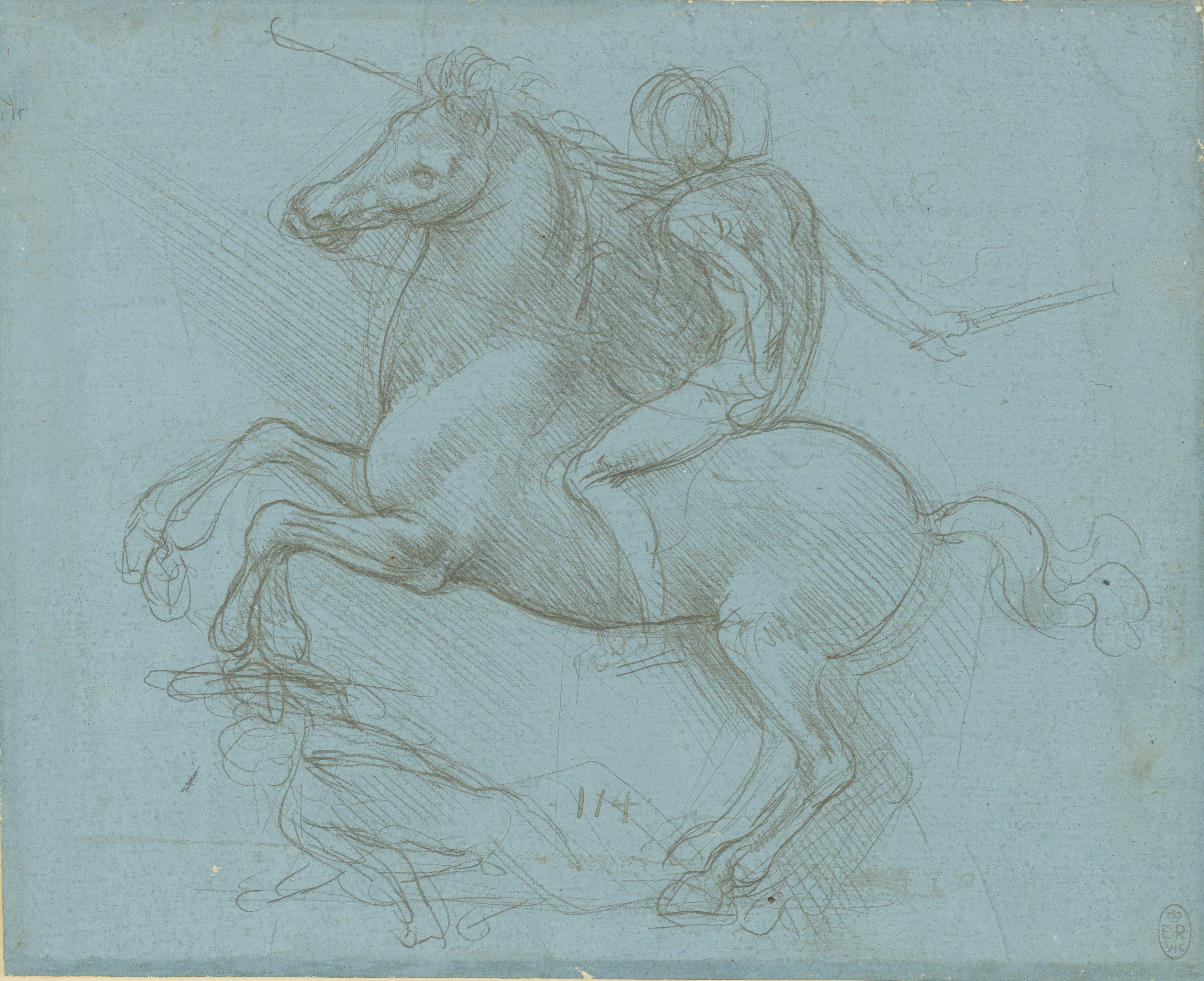 The collection includes A design for an equestrian monument, c.1485-8 which conveys Leonardo’s plans for ground-breaking sculptural design and place him at the leading edge of art in his day. Although no actual sculptures survive, these works highlight his ability to think through his drawings and bring to bear his scientific and engineering knowledge on the making of sculpture.