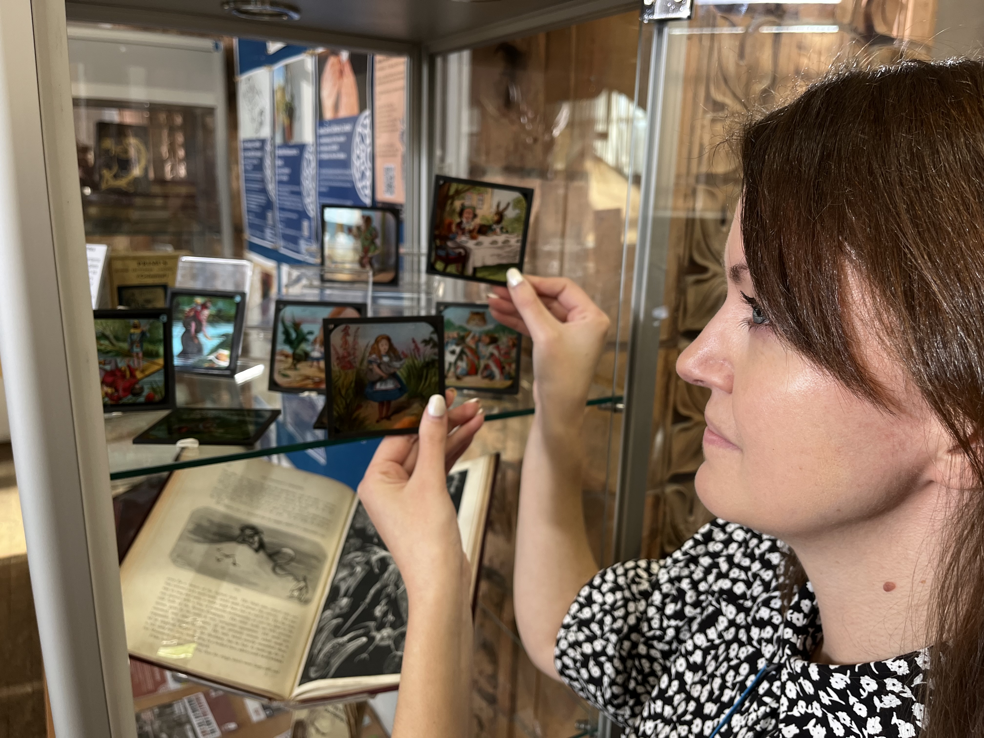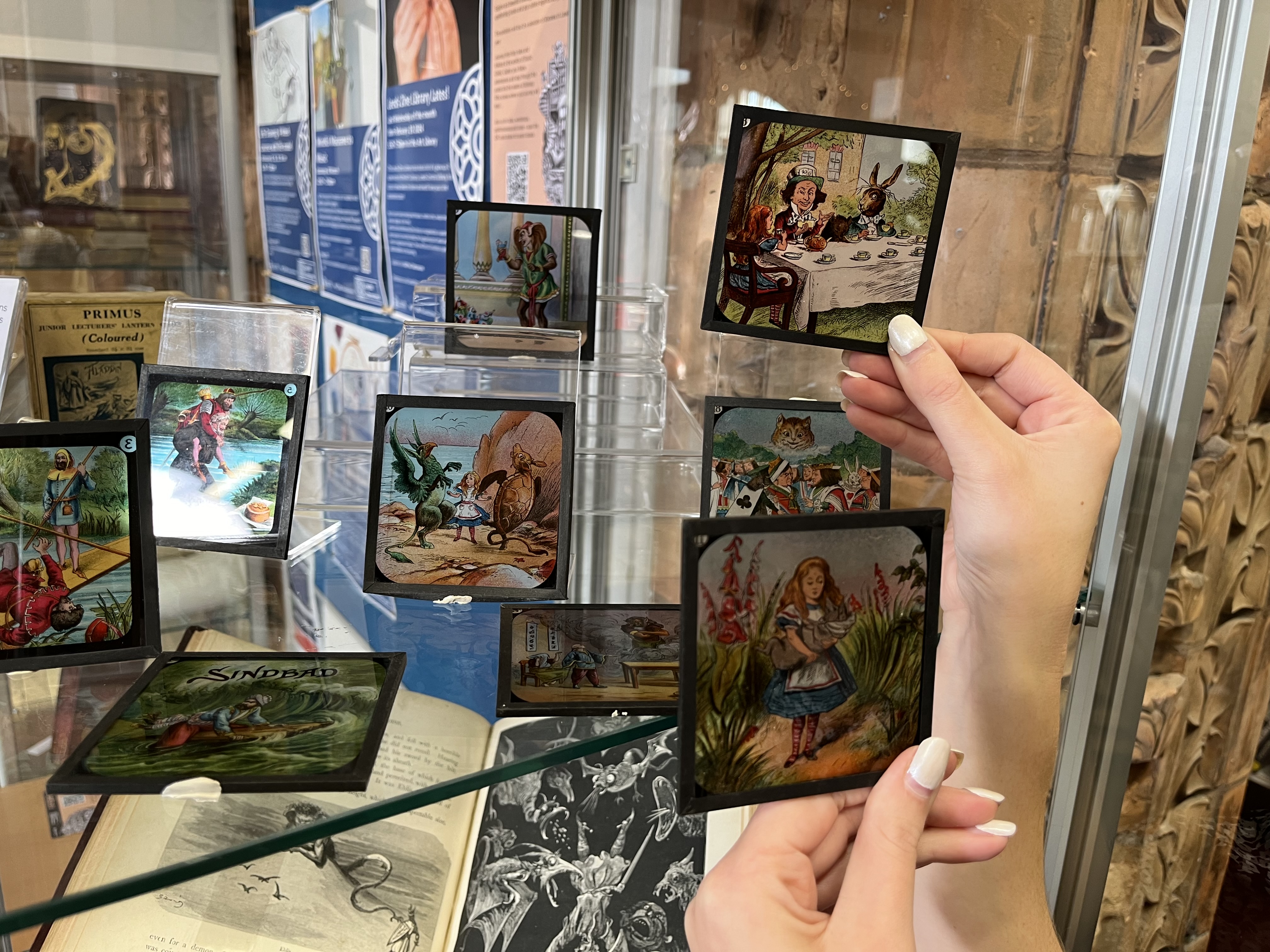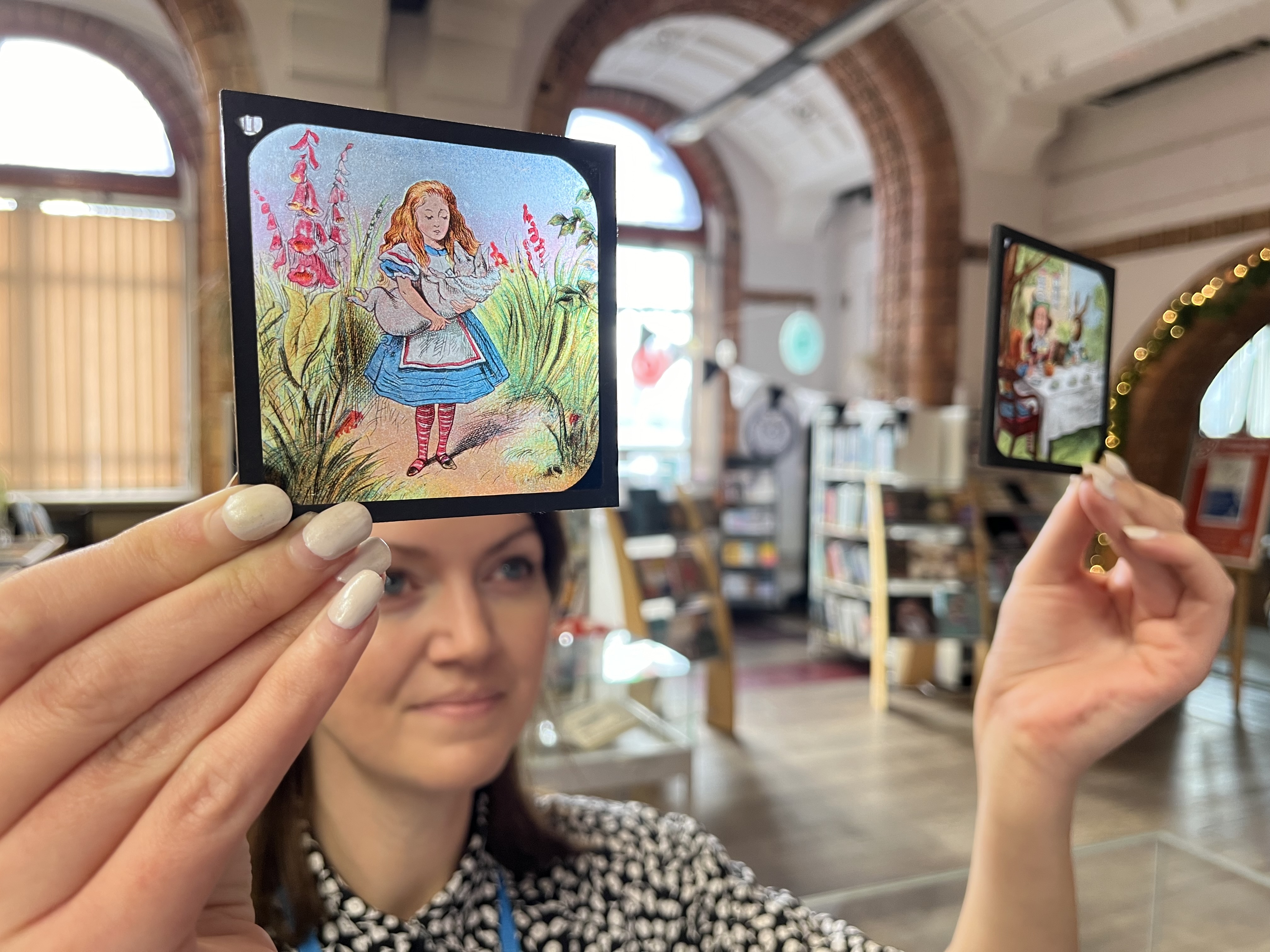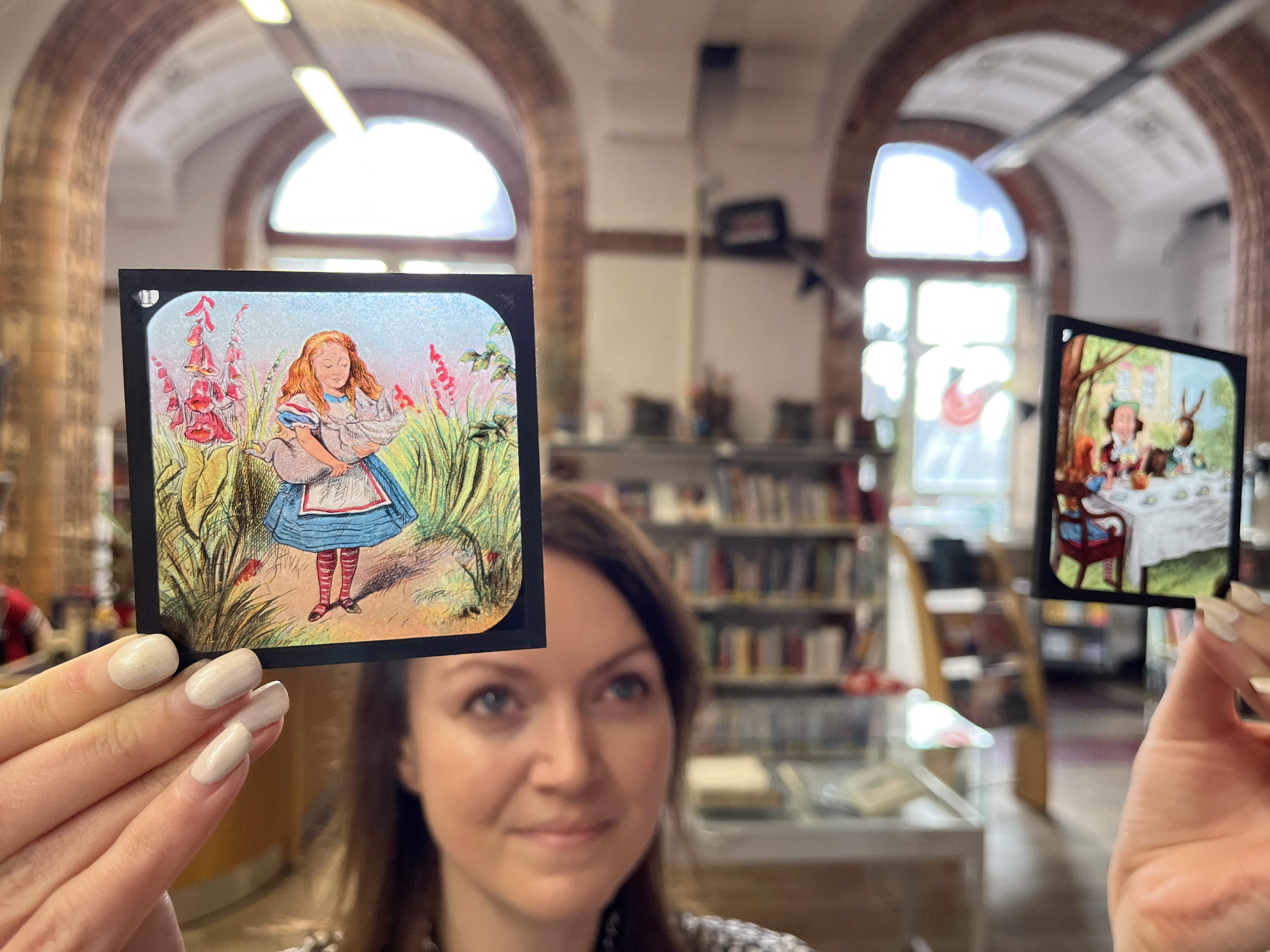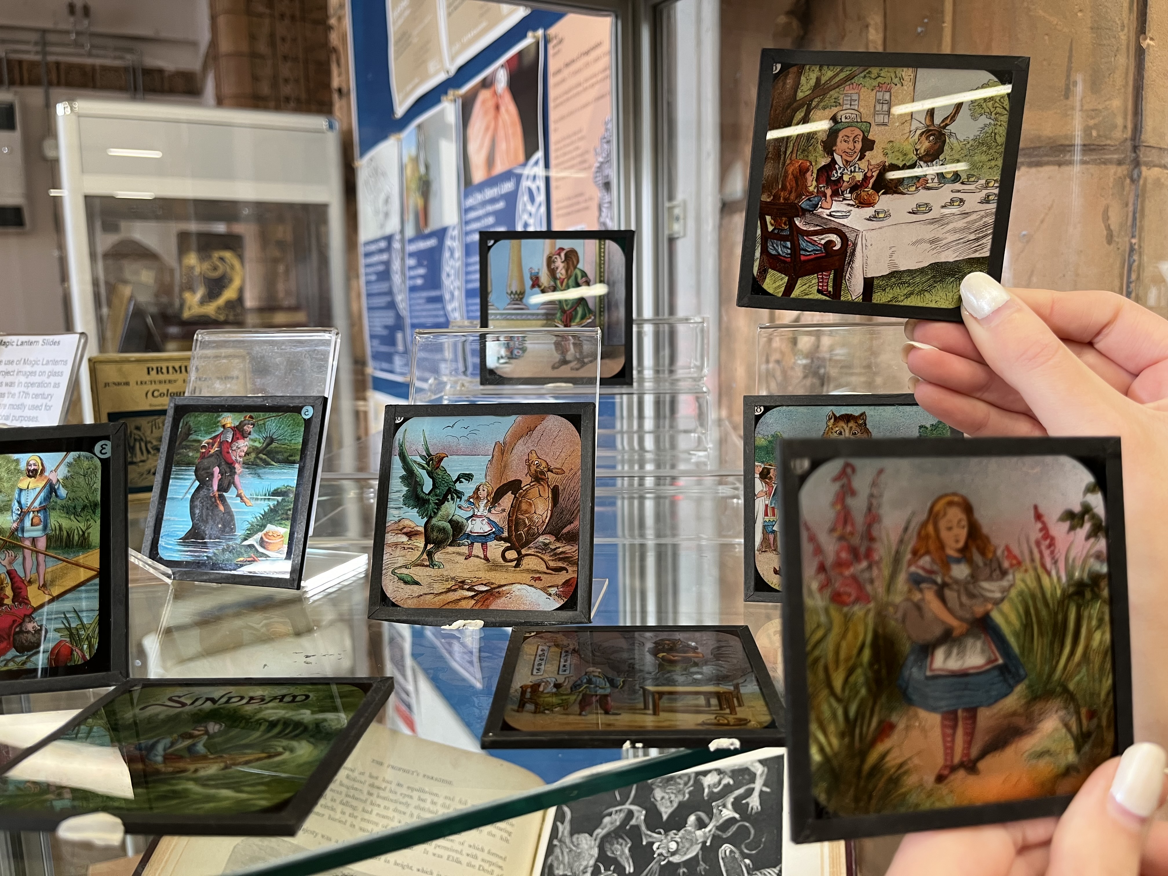 The beautiful, coloured glass slides date from around 1906, and feature moments from classic tales including Alice in Wonderland, Peter Pan and Aladdin.