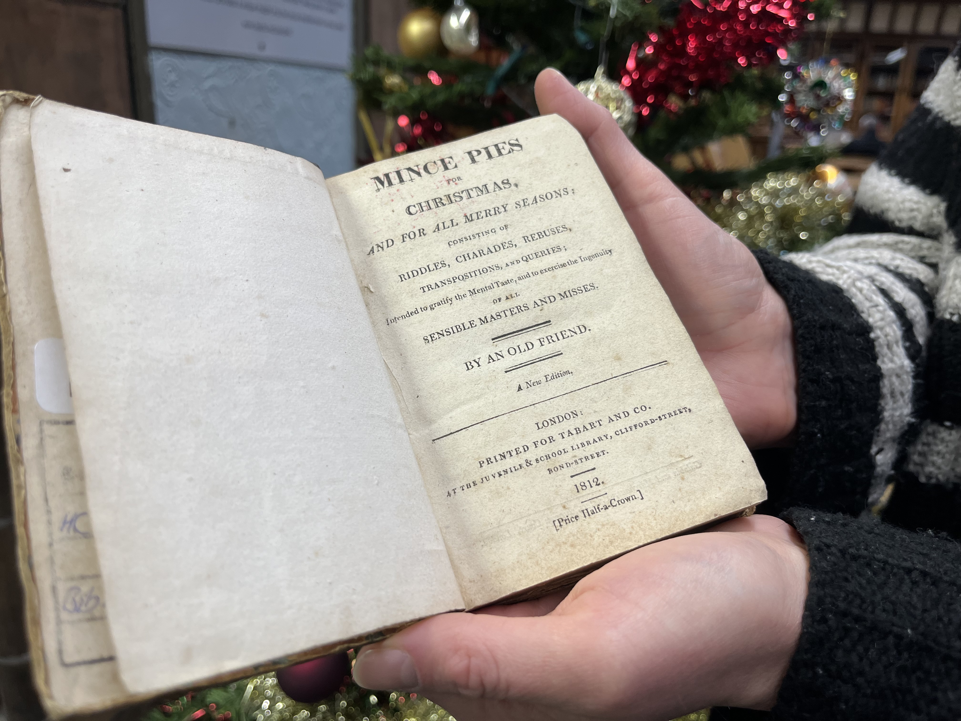 Also on display is a book of children’s Christmas games from 1812 entitled Mince Pies for Christmas. Filled with riddles and games, the book claims ‘to exercise the ingenuity of all sensible masters and misses.’