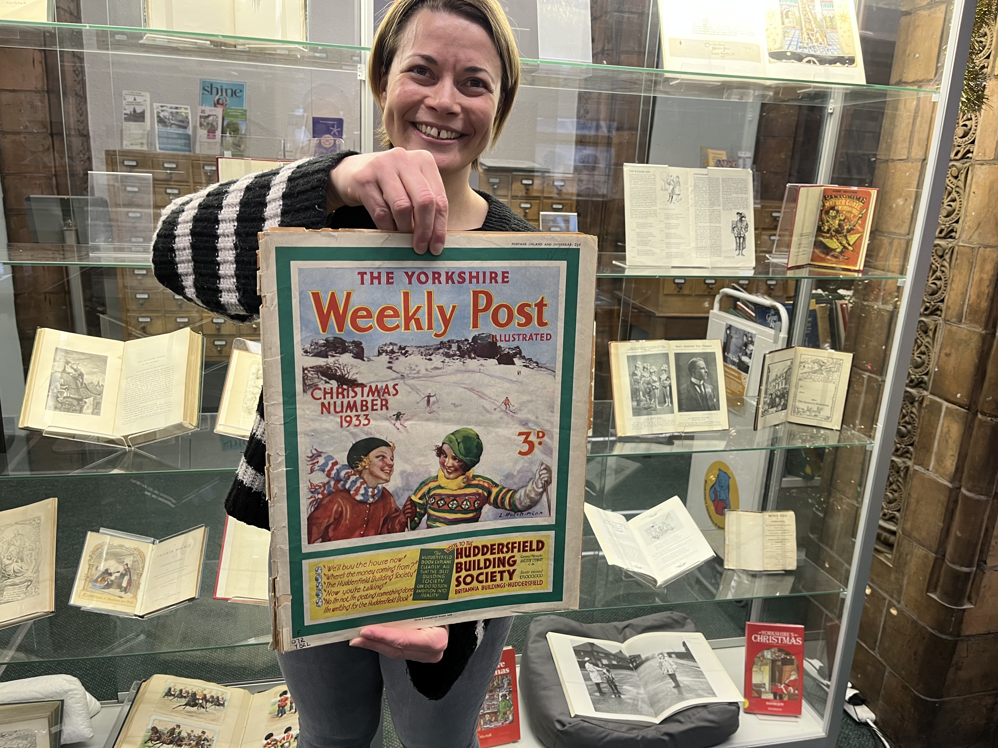 Other items in the display include a collection of illustrated military themed Christmas cards as well as Christmas Editions of the Yorkshire Weekly Post and Yorkshire Evening Post from 1905, 1924, 1929, 1933.