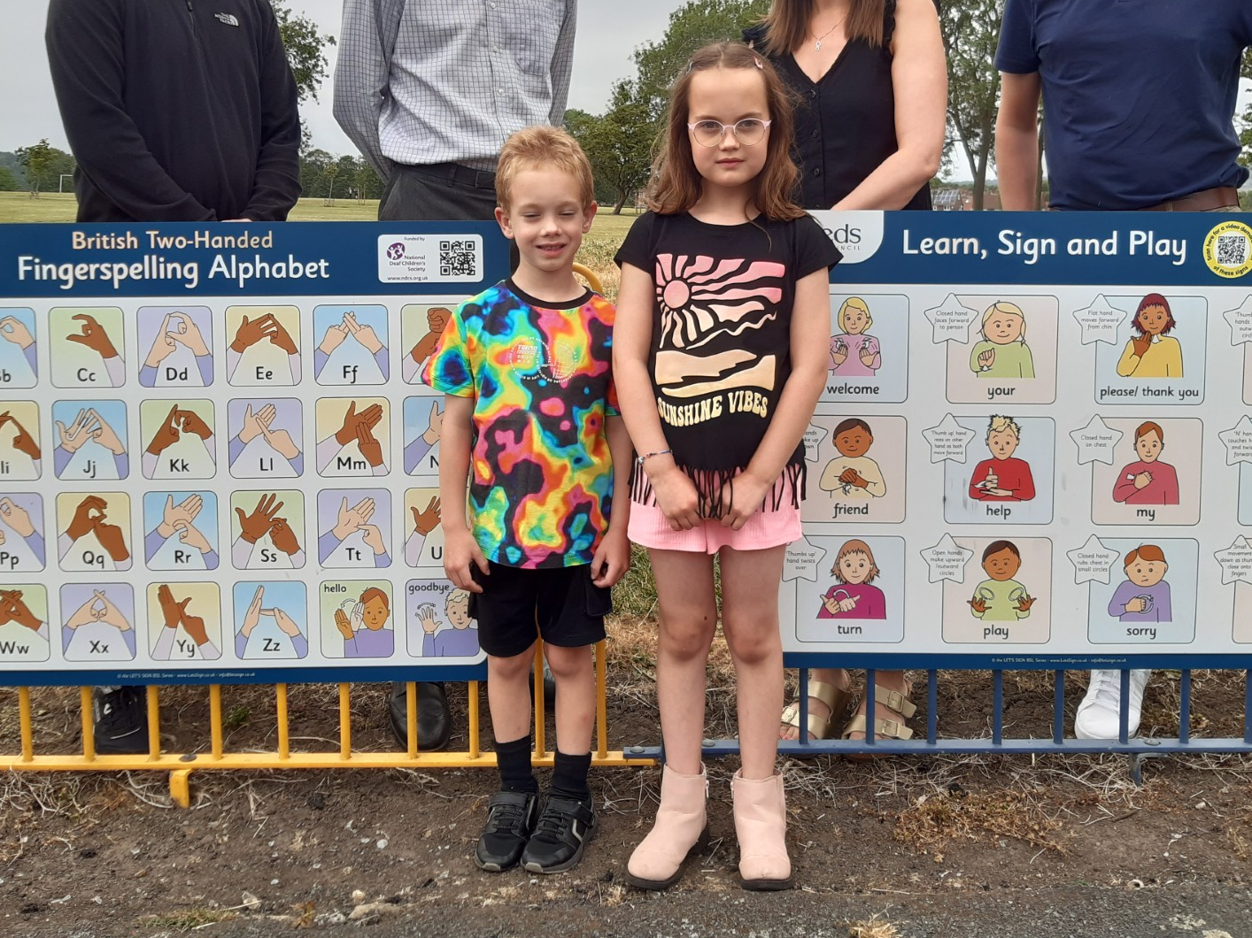 Funded by the National Deaf Children's Society, two boards have been put up at 10 playgrounds, showcasing the British Sign Language (BSL) fingerspelling alphabet and a selection of helpful words when playing.