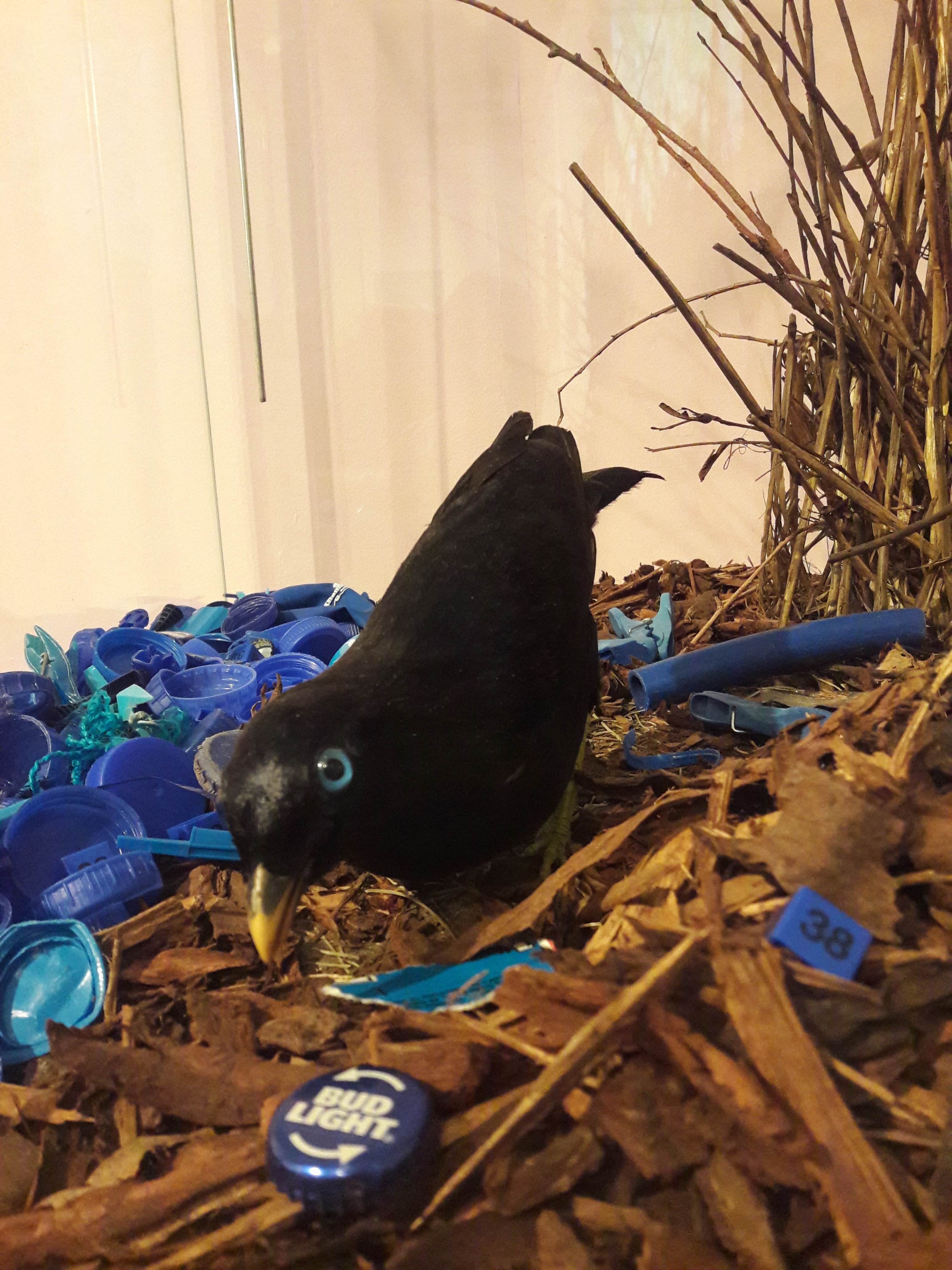 Satin Bowerbirds, like the one currently on display in Leeds City Museum’s Beavers to Weavers exhibition, prefer blue objects like petals and berries and also sometimes pick up litter like plastic bottle tops and straws.