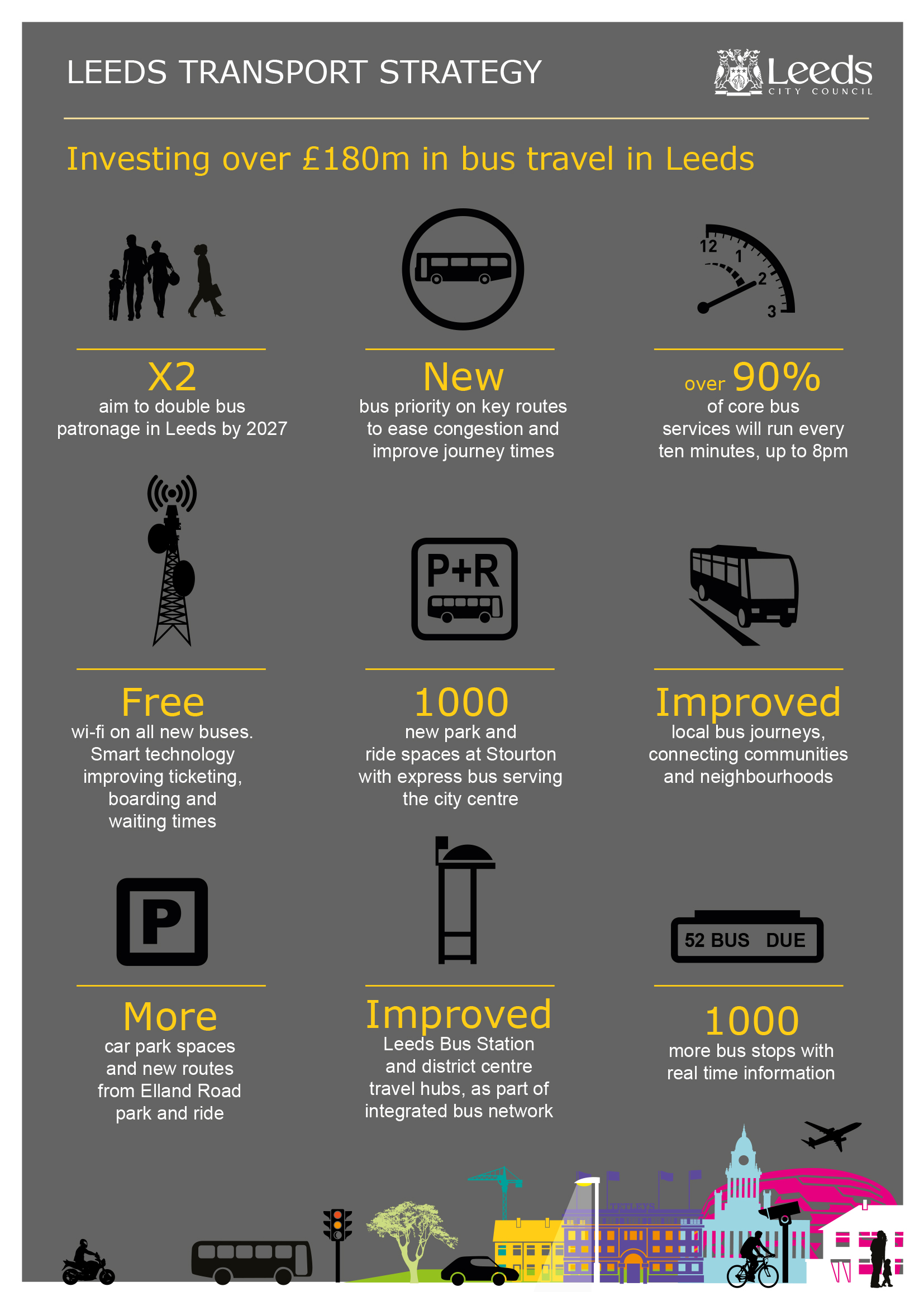 Following on from yesterday’s announcement on rail improvements with new stations serving Leeds Bradford Airport and at the White Rose Centre and Thorpe Park, Leeds City Council has today confirmed significant investment is also proposed to transform bus services.