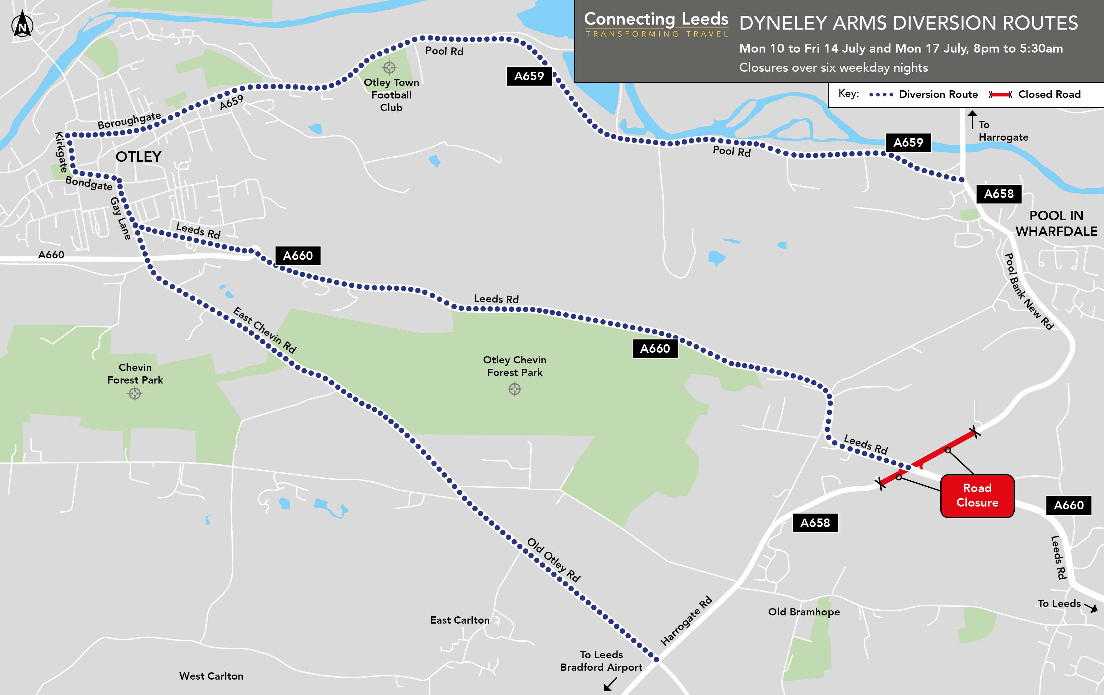 “I would like to thank road users for their patience in advance during this disruption at Dyneley Arms and A6120 Broadway (Fink Hill). To help minimise disruption, these road closures and works are planned and co-ordinated around hundreds of other works in the city. This will enable the works at Dyneley to finish ahead of the summer holidays, which will aid traffic as it forms part of the diversion route for the closure to Harewood Bridge on 26 July.
