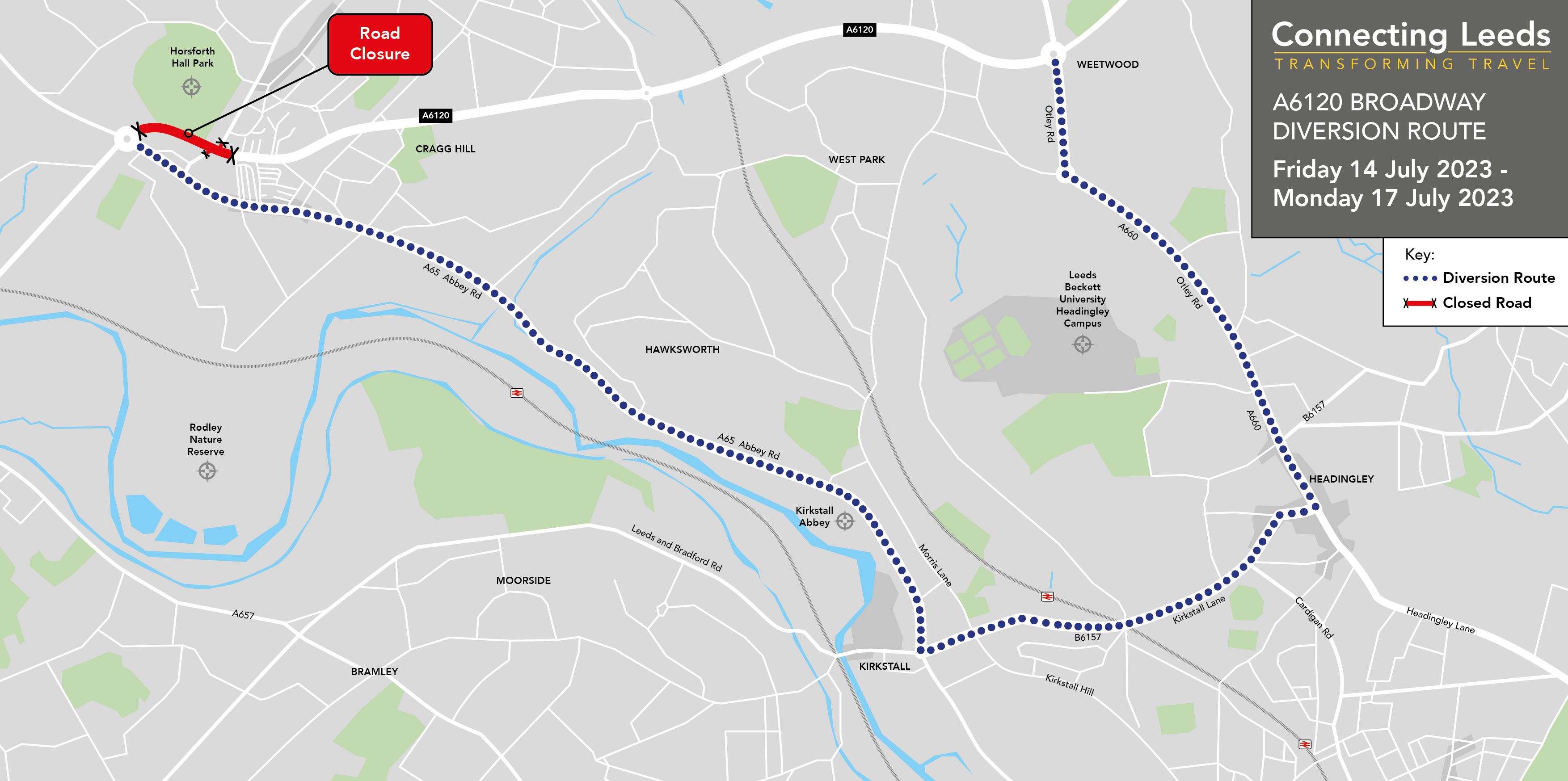 Following the completion of the first of phase of resurfacing works between Horsforth roundabout and the Fink Hill junction earlier this month, the second phase of resurfacing will take place at Fink Hill and Parkside junctions. From 8pm Friday 14 July to 6am Monday 17 July, the A6120 Broadway between Rose Terrace and Horsforth roundabout will close to traffic in both directions. The footways will remain open.