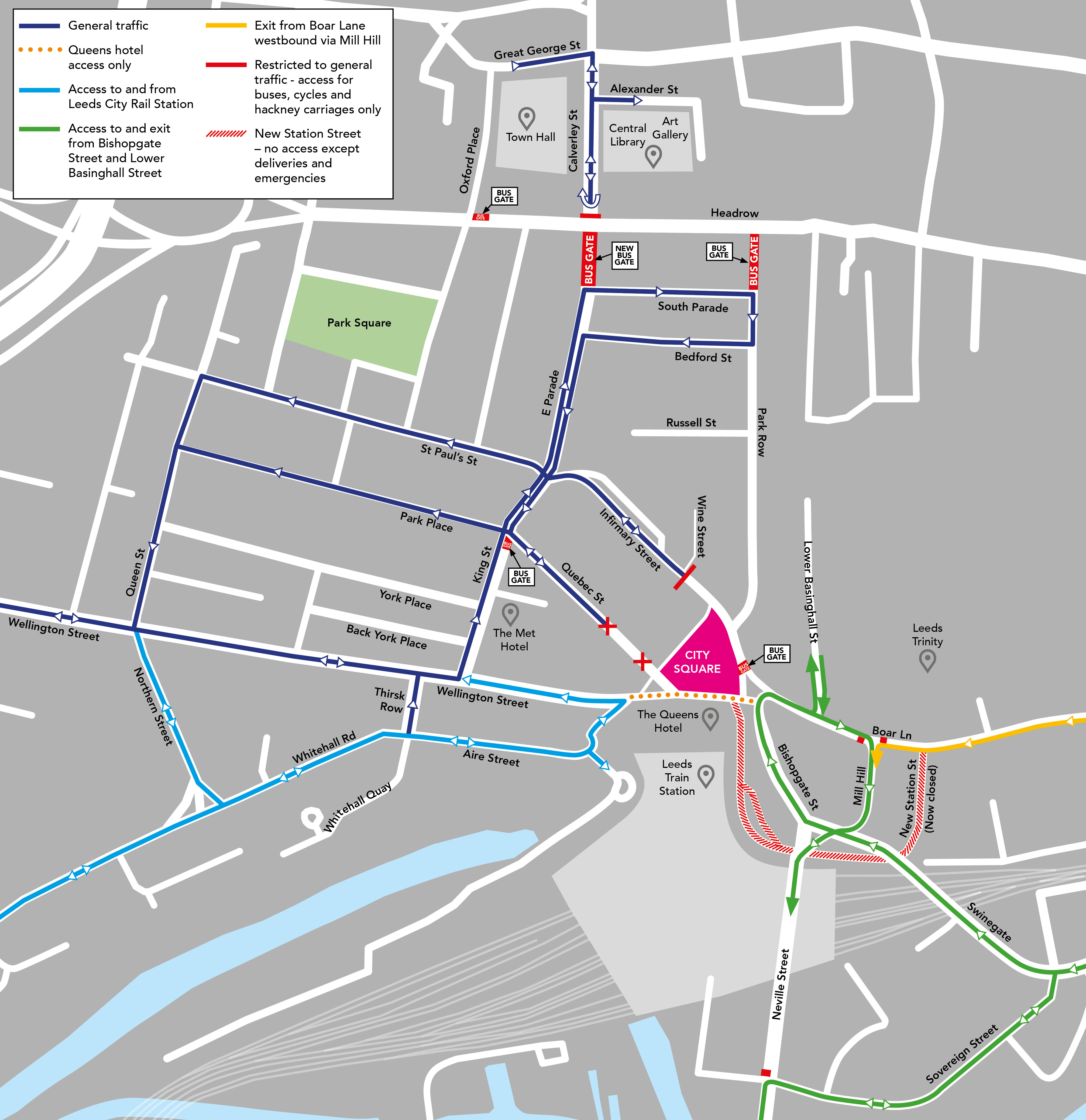 Map to show access for vehicles avoiding City Square Bus Gates and East Parade