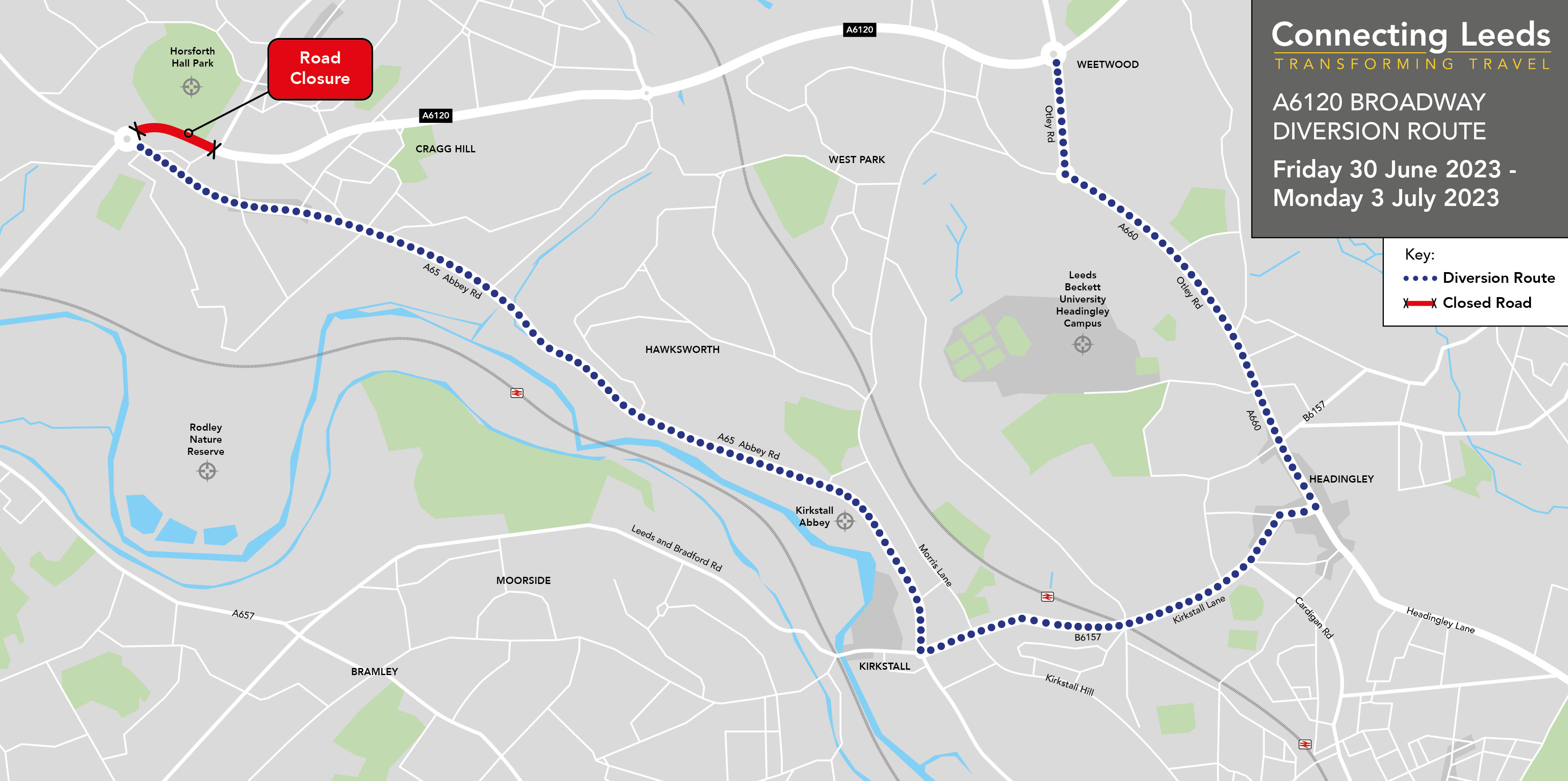 From Friday 30 June (8pm) to Monday 3 July (6am), the A6120 Broadway between Fink Hill and Horsforth roundabout will close for the weekend to traffic in both directions, to allow for the first phase of carriageway resurfacing. During the closure the footways will remain open.