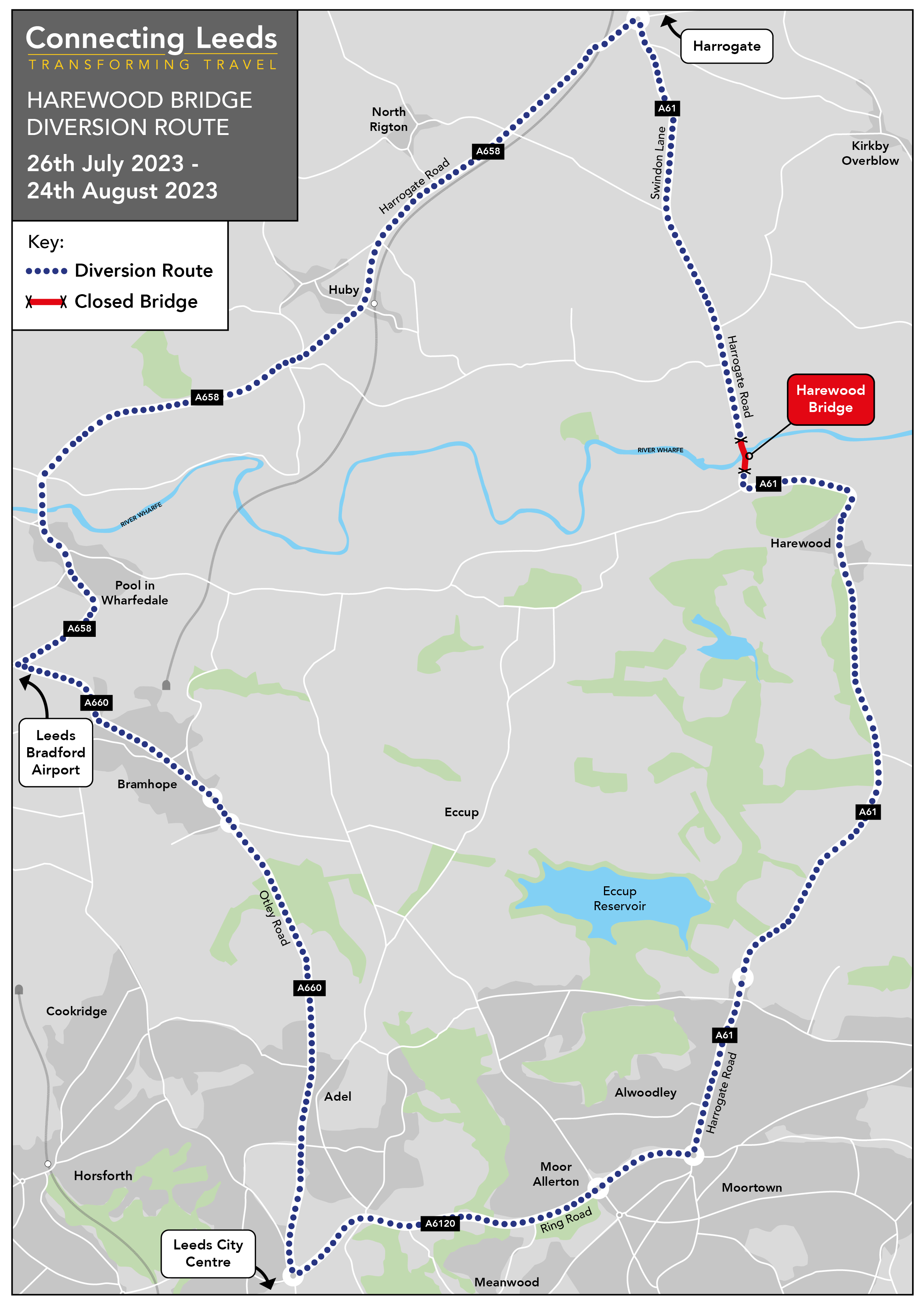 Harewood Bridge will close in both directions to all vehicles for four weeks on Wednesday 26 July to Thursday 24 August 2023, for essential maintenance. The footway across the bridge will remain open throughout the works.