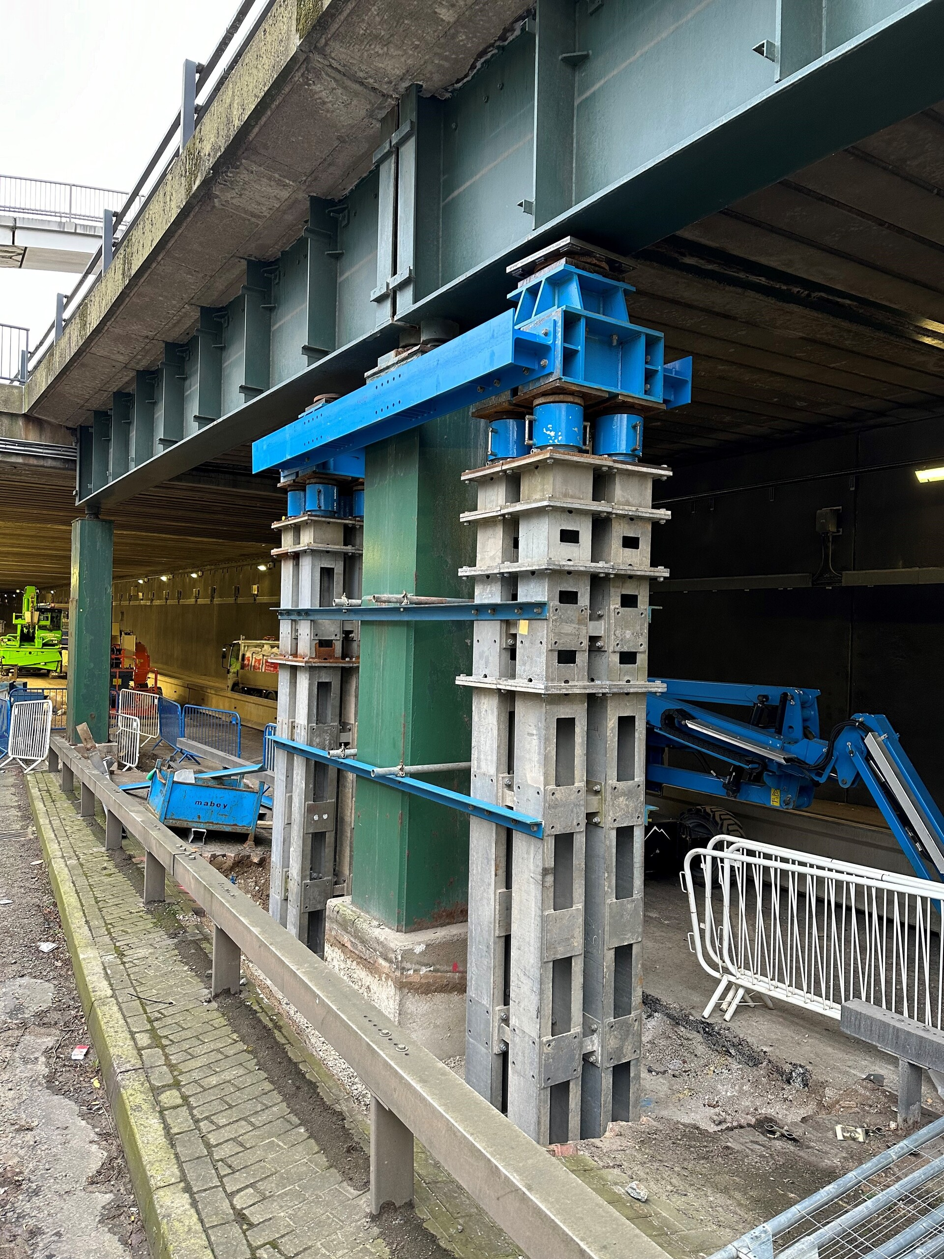 Modern bridges are designed to make future bearing replacement straight forward. However older bridges, such as the New York Road Flyover, require substantial temporary works with heavy equipment including temporary foundations to support the bridge at each bearing. To maintain the structural integrity of the bridge the work needs to be phased and some structural components strengthened.