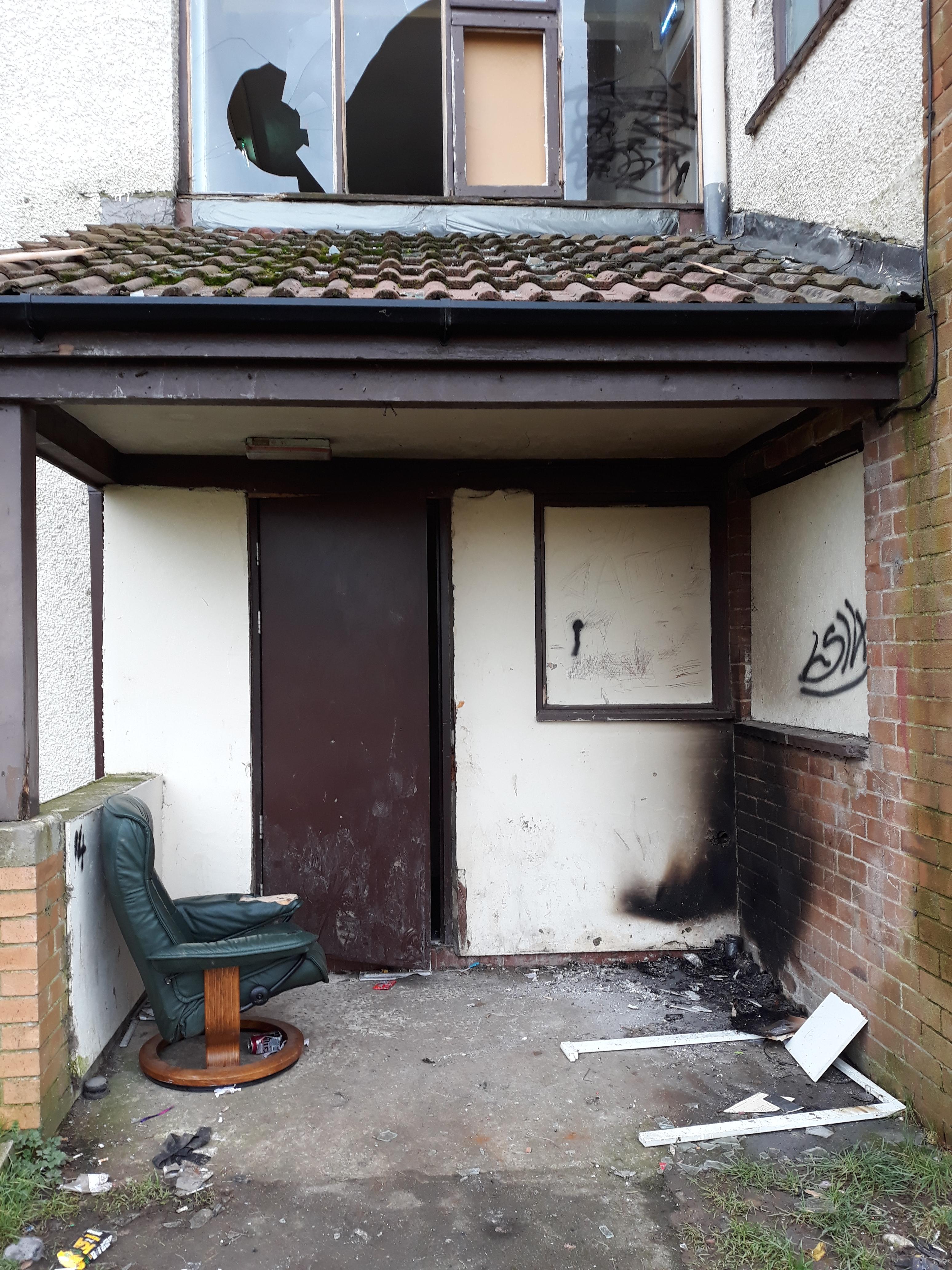 - All ground floor flats insecure and vandalised causing extensive damage and water running from broken pipes.