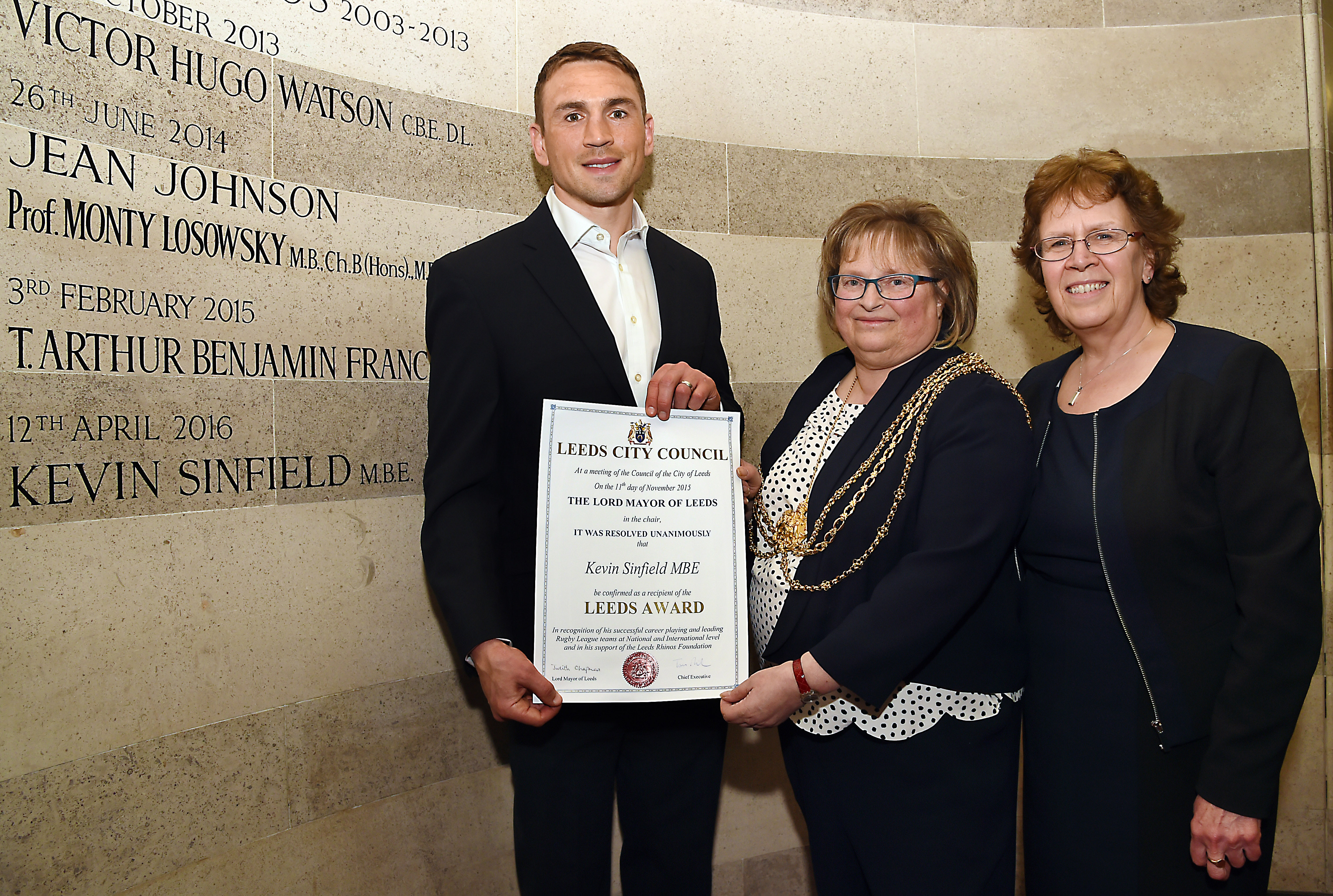 Kevin, who was made captain of the club at the age of just 22, was surprised with the accolade by the leader of Leeds City Council Councillor Judith Blake at a special city dinner marking the historic treble by the Rhinos last season. This week’s event was a chance for the 35-year-old to collect his award in person and see his name written on the hall of fame ‘Leeds Award’ wall.