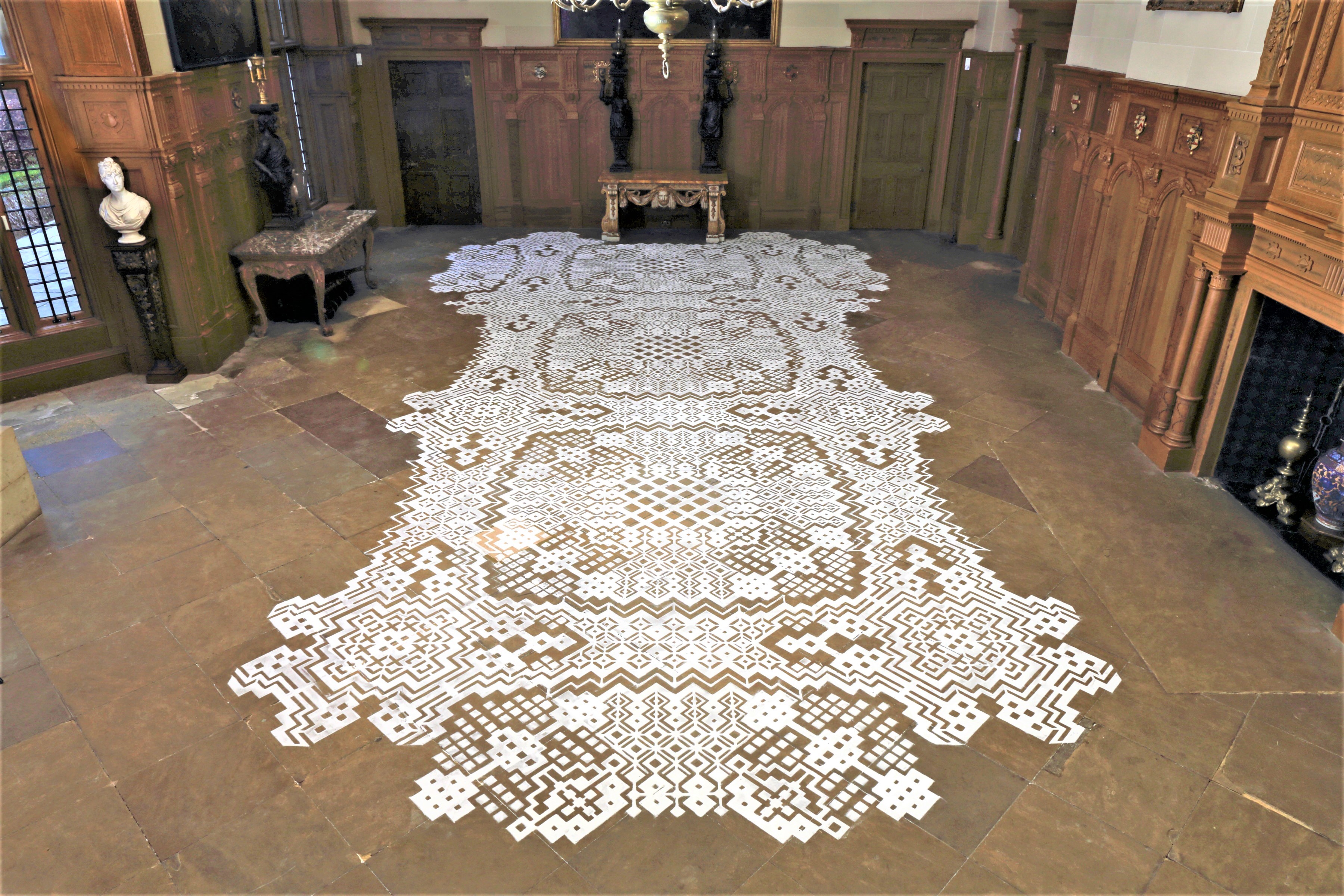 Using salt to replicate the beautiful design of an early piece of woven table linen, over the past few weeks the artist has meticulously crafted a series of large scale temporary pieces across the floor of the majestic hall.