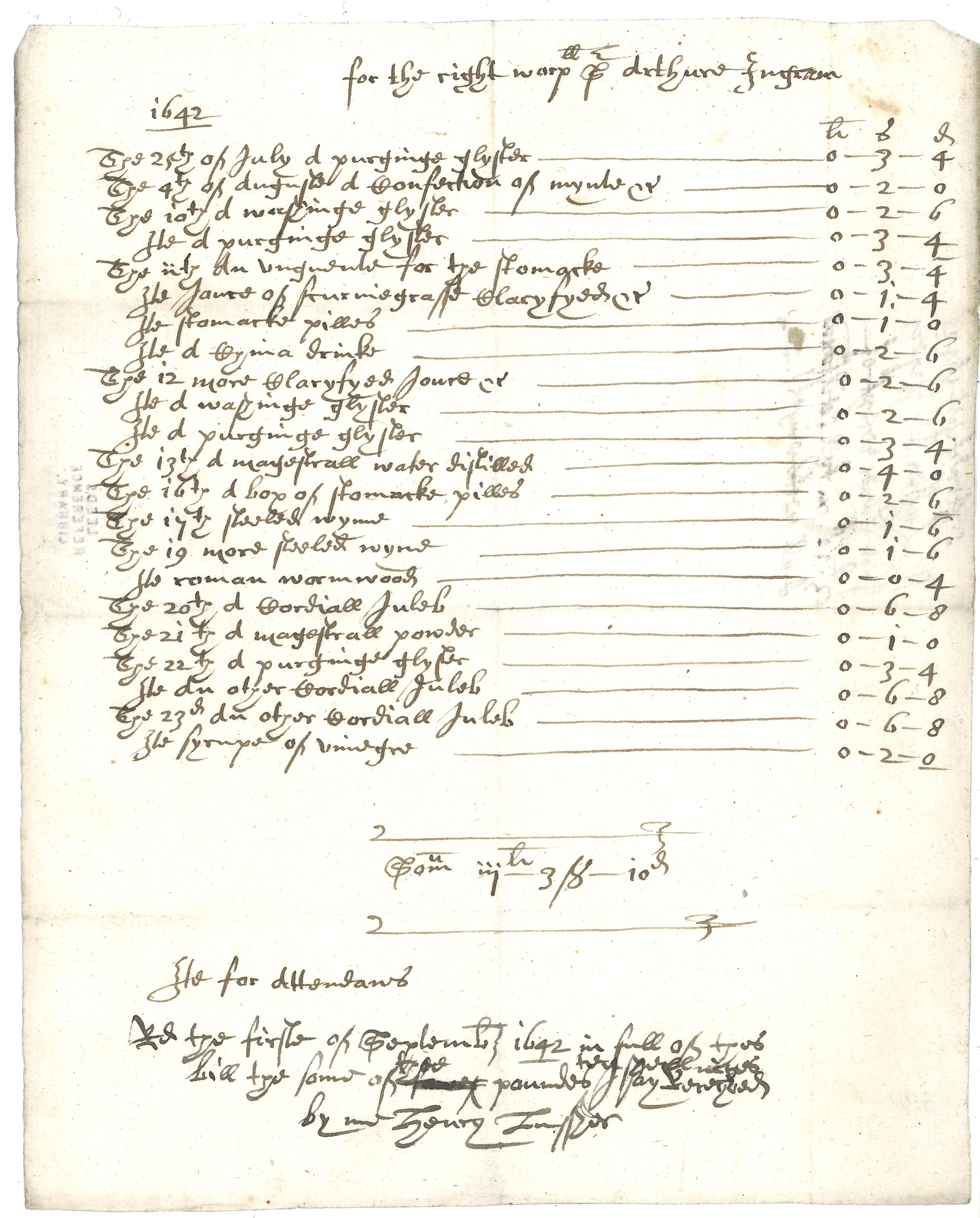 Among the items specified on the English Civil War era shopping list is an order for a number of bottles of “China drink”, the old name for tea, with each bottle priced at four shillings and sixpence.