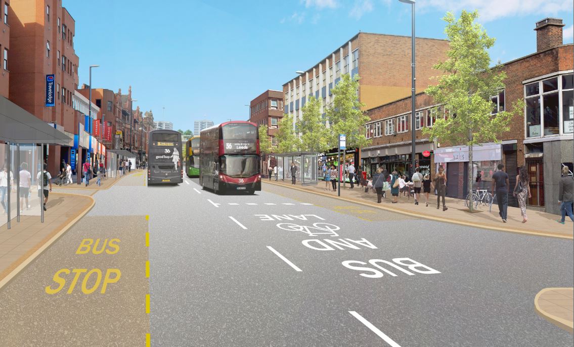Vicar Lane to open to buses travelling both ways for first time in over 50 years, improving journeys and traffic circulation in Leeds city centre.