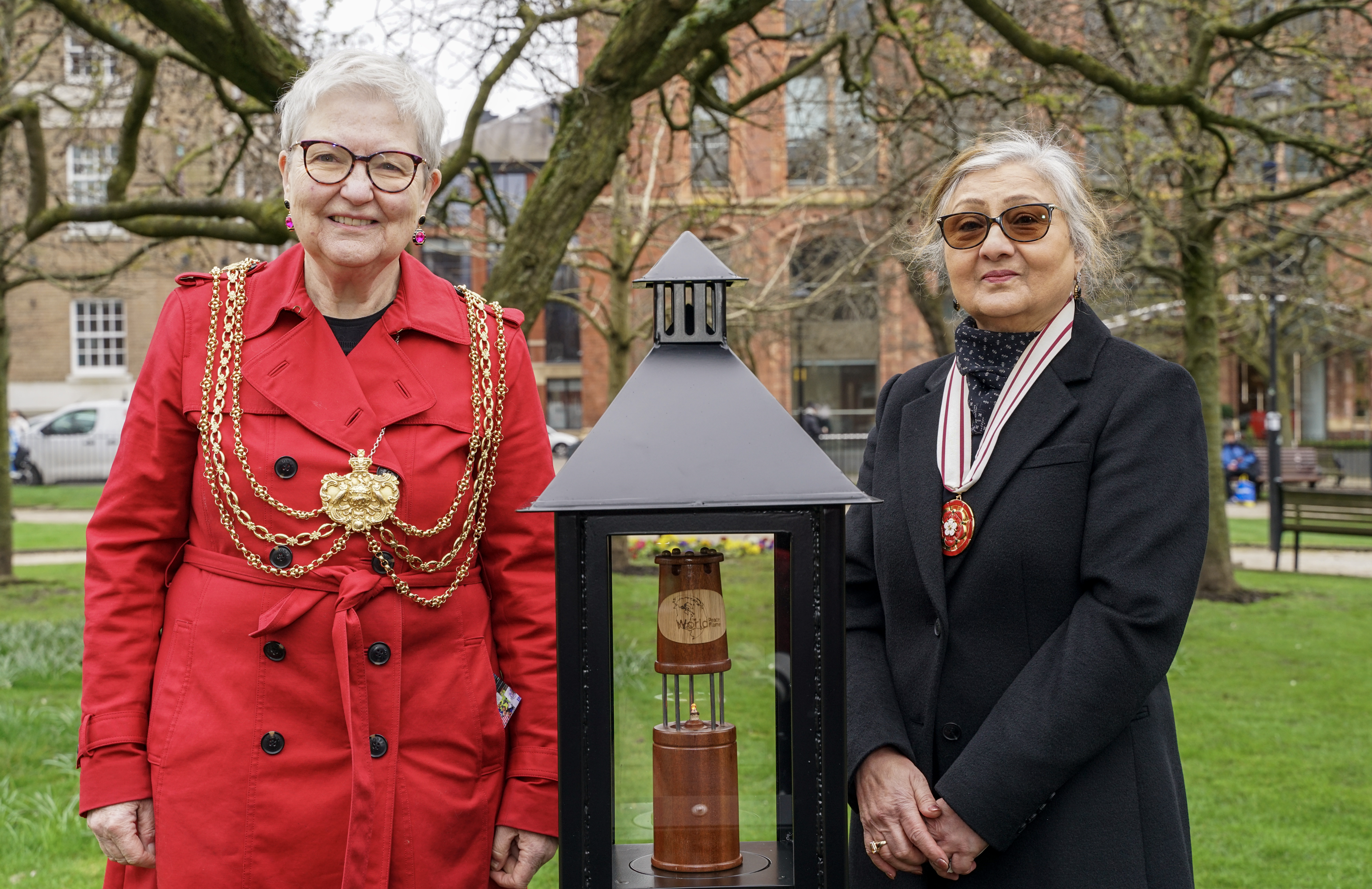 Photo 2 - The Lord Mayor of Leeds, Councillor Al Garthwaite and Deputy Lieutenant of West Yorkshire, Dr Kuldip Kaur Bharj, OBE DL with the new Park Square World Peace Flame.