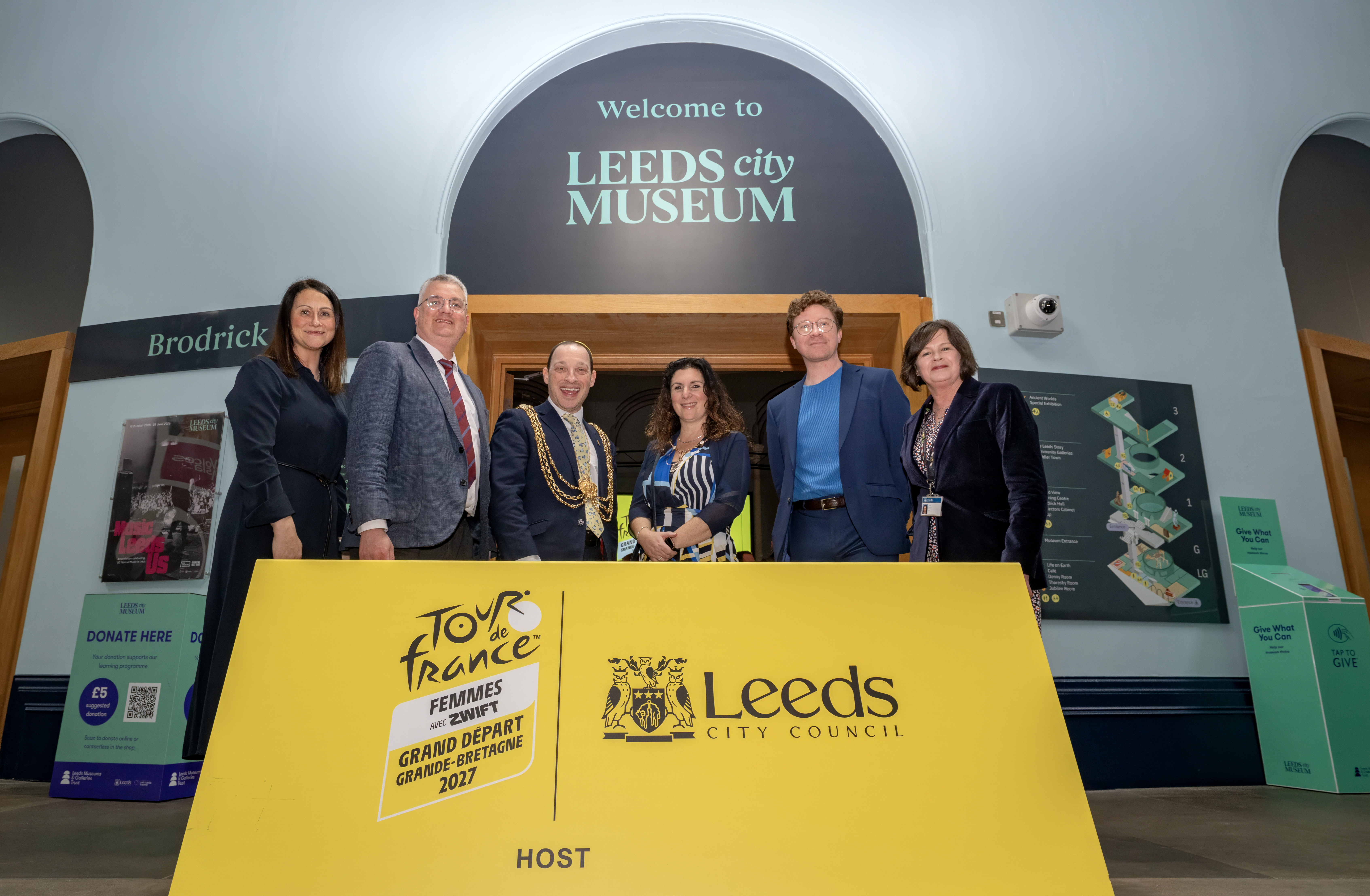 Left to right: Angela Barnicle (Leeds City Council's director of city development), Councillor James Lewis (leader of Leeds City Council), Councillor Dan Cohen (Lord Mayor of Leeds), Elayna Cohen (Lady Mayoress of Leeds), Councillor Jonathan Pryor (Leeds City Council's deputy leader and executive member for economy, transport and sustainable development) and Jane Walne (Leeds City Council's chief officer for Active Leeds, operations and culture) at Leeds City Museum during the announcement event for the Grand Départs of the 2027 Tour de France and Tour de France Femmes avec Zwift.