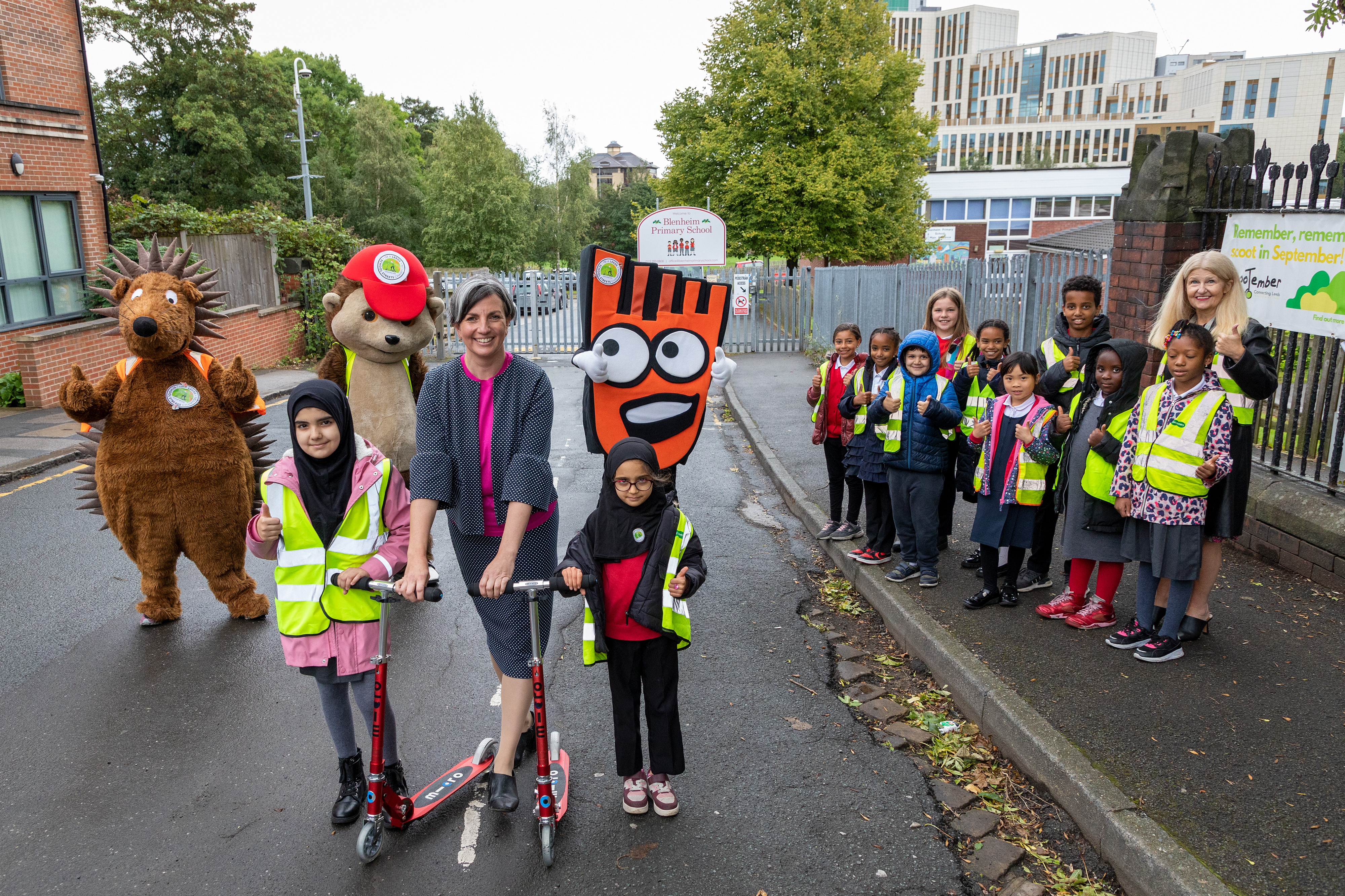 R-L - Mo Duffy, Headmaster of Blenheim Primary School, pupils of Blenheim Primary School, mascot Strider, Leeds City Council’s executive member for sustainable development and infrastructure, Councillor Helen Hayden, mascot Kerby and mascot Spike.