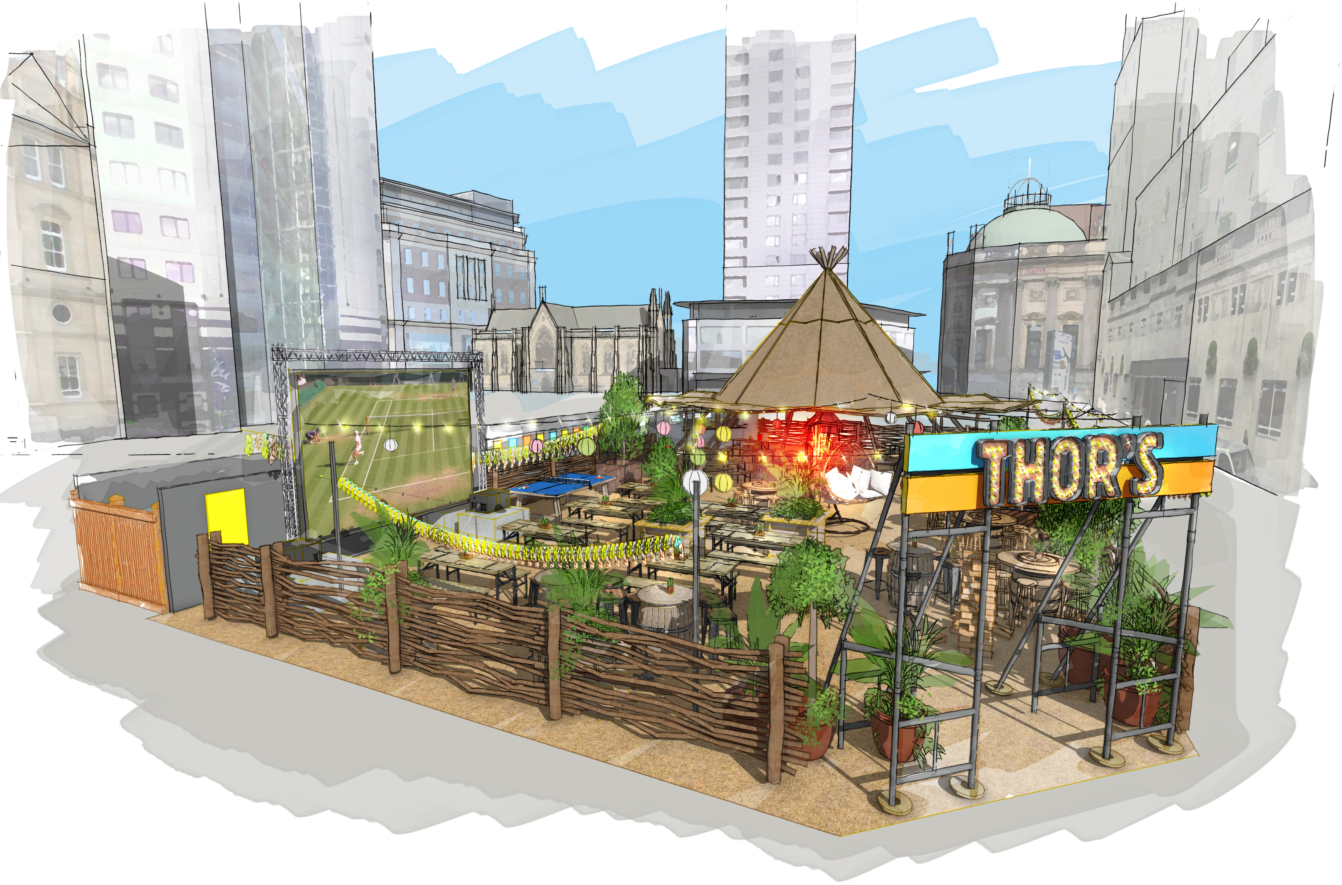 Artist's impression of how the new Thor's Tipi on City Square will look with summer. The square, which has been transformed by one of the city’s most ambitious ever transport projects, will be the setting for a brand new Thor’s Tipi bar, monthly artisan market and a line-up of family-friendly activities as well a big screen showing some of the season’s biggest sporting highlights.