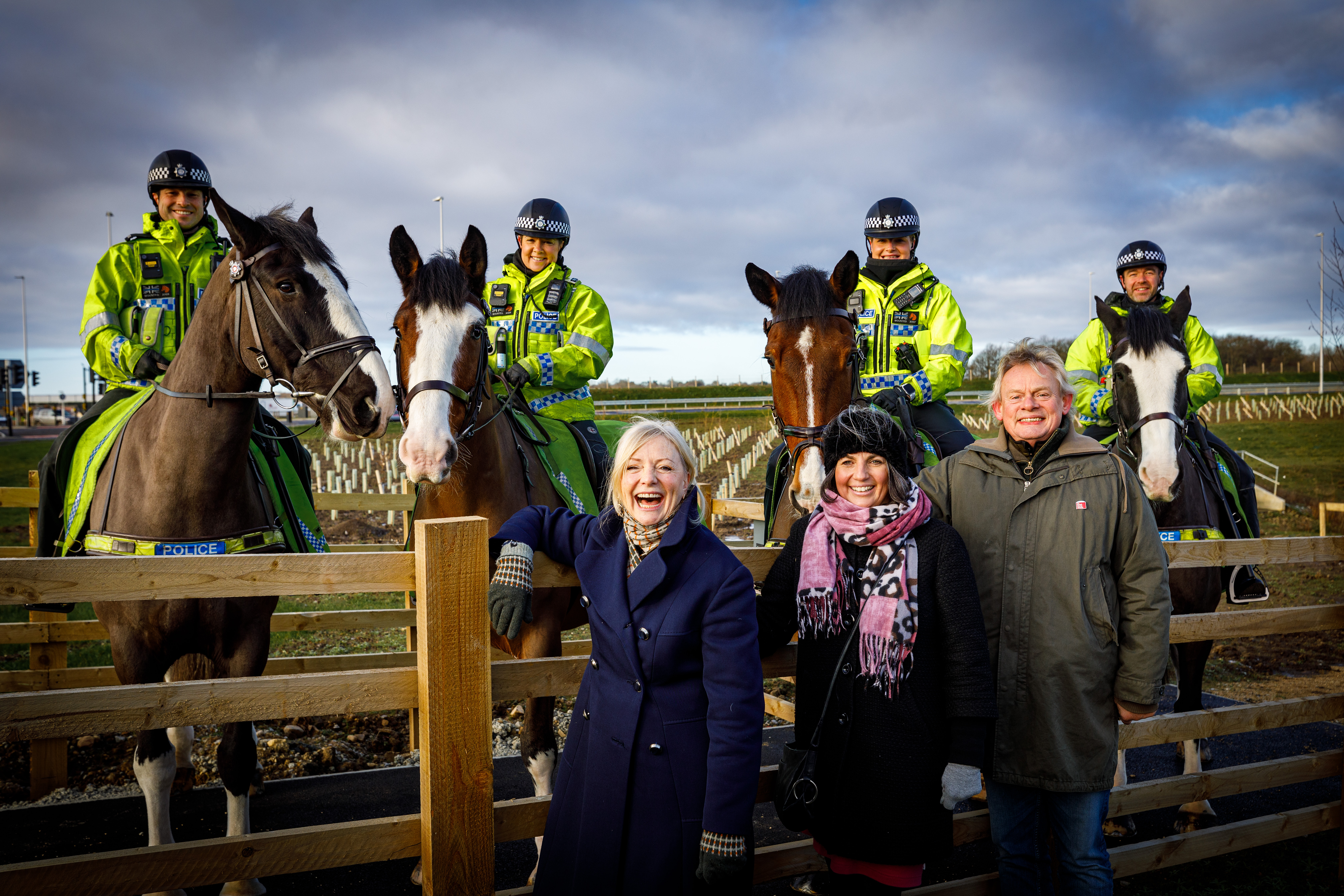 Martin Clunes, Councillor Helen Hayden and West Yorkshire Mayor, Tracy Brabin welcomed the mounted police unit from the West Yorkshire Police to celebrate the 7km equestrian route on the East Leeds Orbital Route.