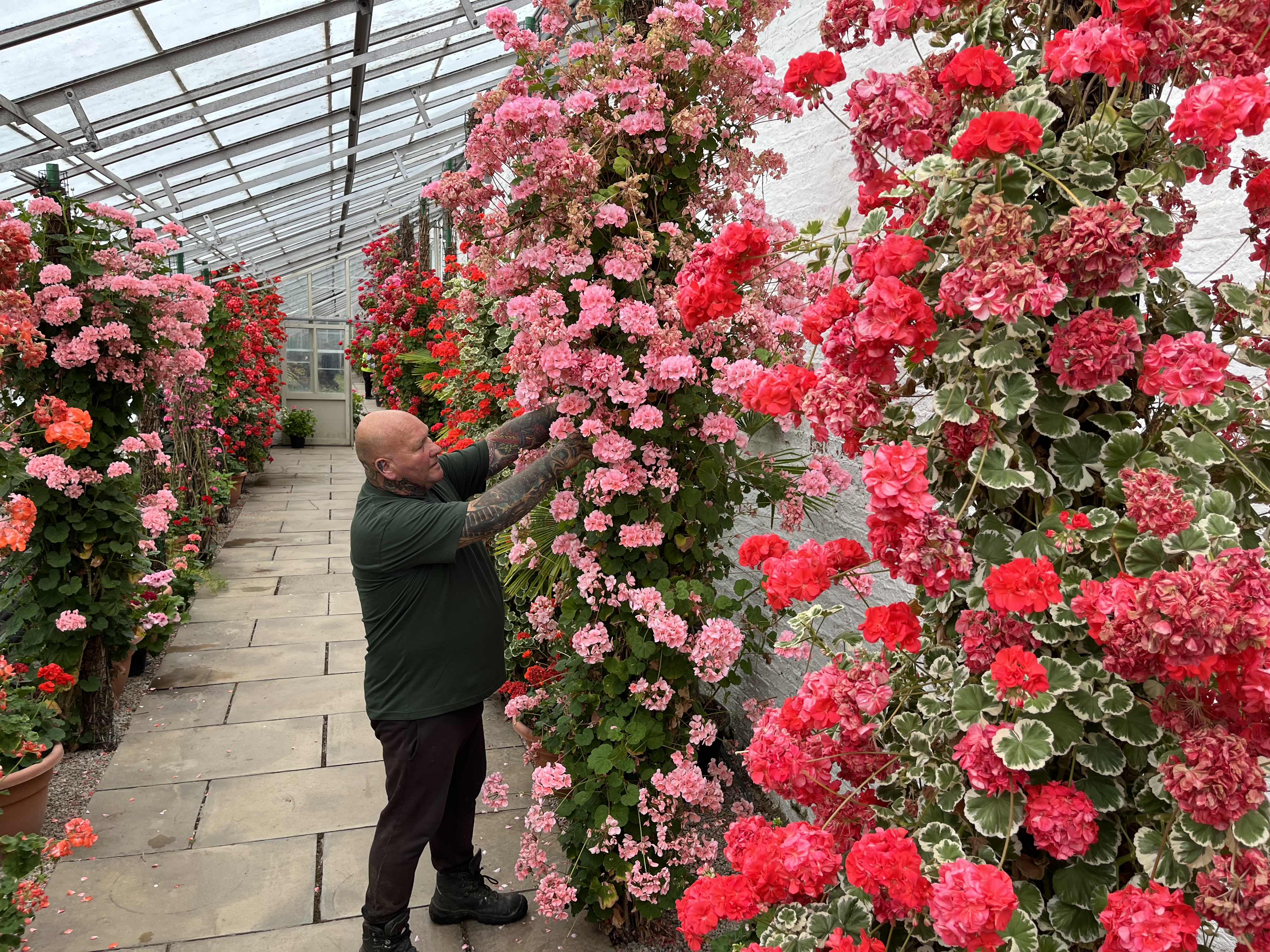 Head gardener Mick Jakeman tends to the stunning Zonal Pelargoniums which have burst into life in the hothouse at Temple Newsam's Walled Garden.
