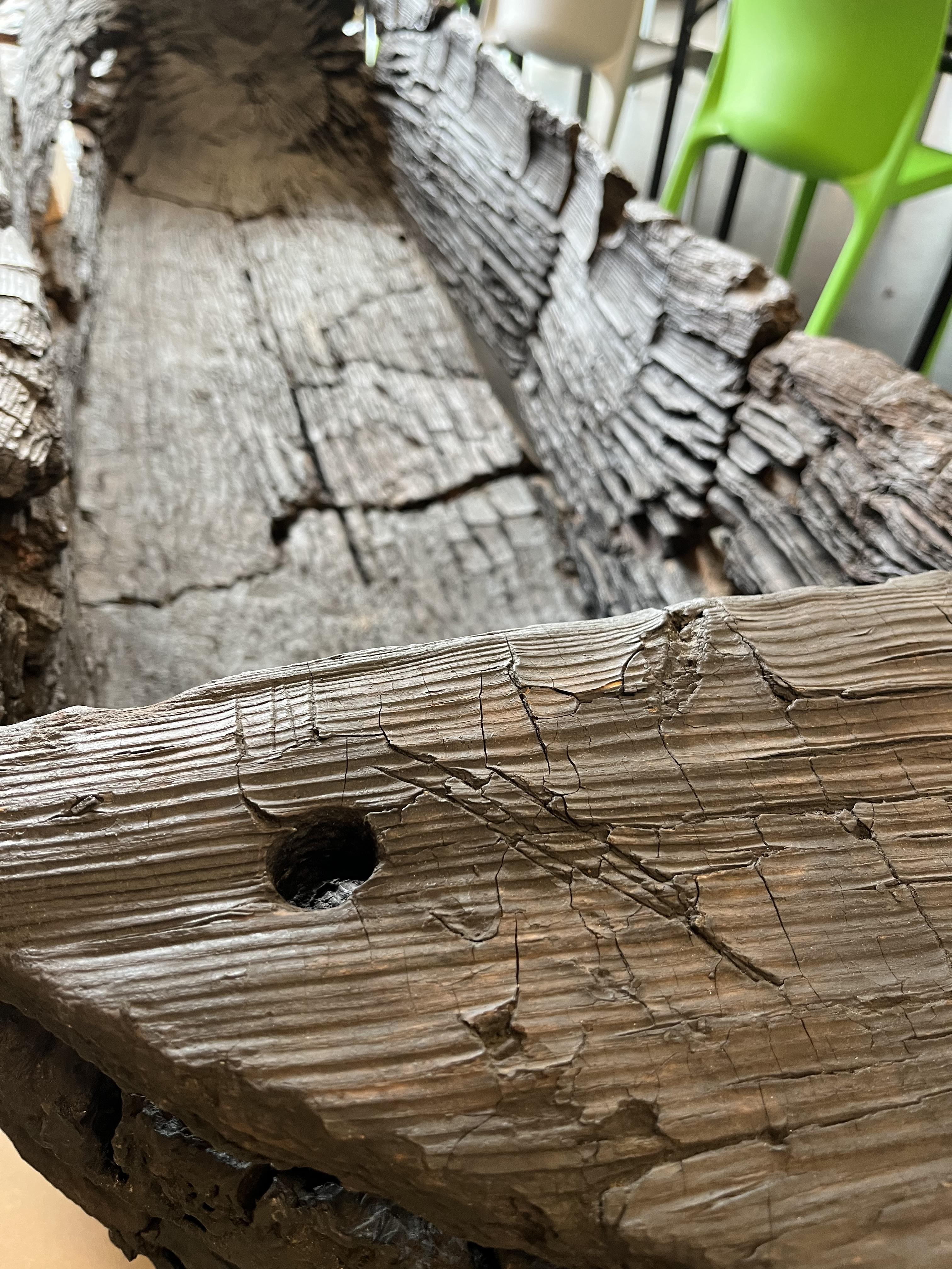 The centuries-old carved logboat, which dates from the 1300s at Leeds Discovery Centre. The watercraft had lain beneath the soil for more than 500 years before being discovered by Joseph Taylor in 1863 while he was digging some drainage works near Giggleswick Tarn in North Yorkshire.