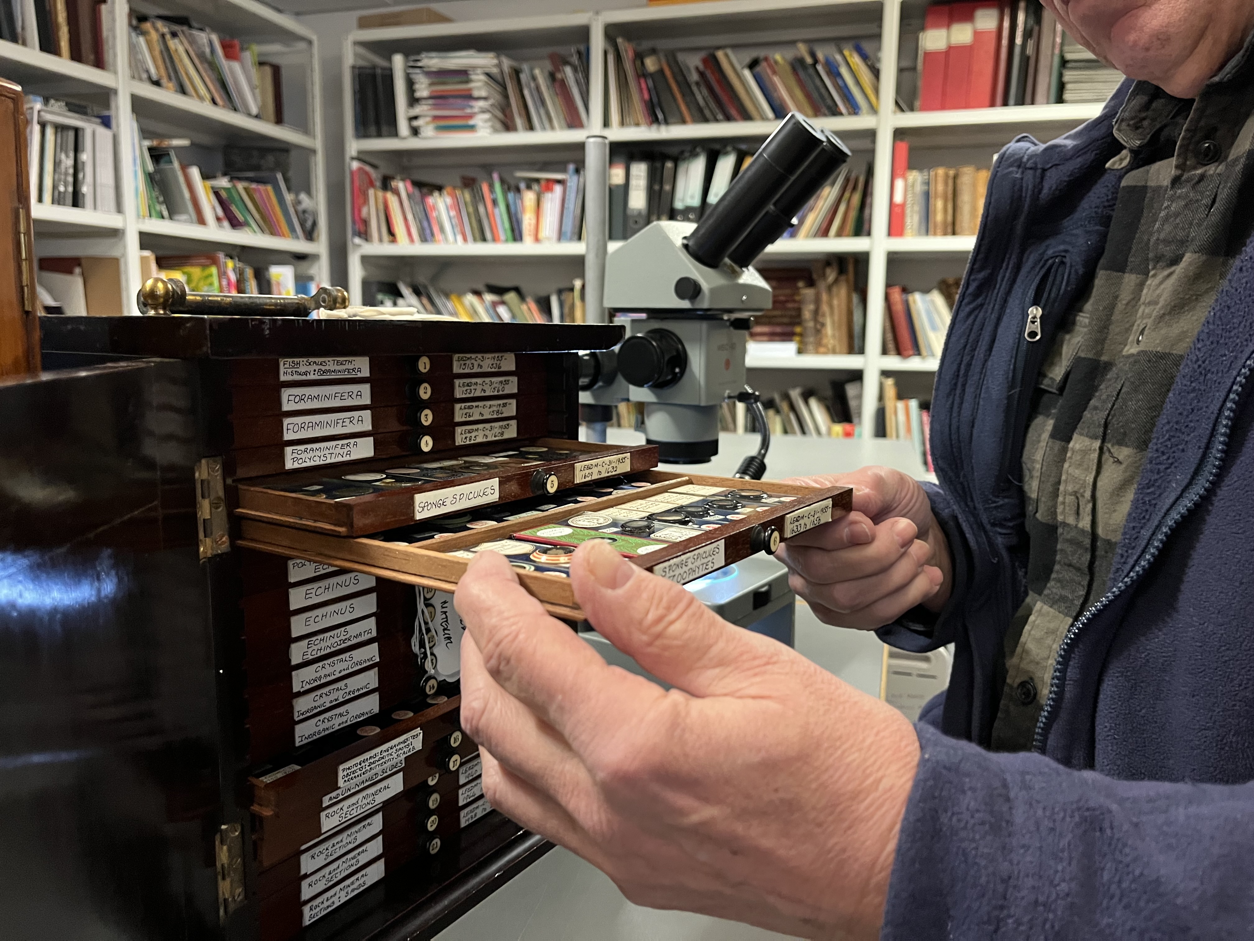 Volunteer Stephen Crabtree uses a microscope to study the slides at the Leeds Discovery Centre. Stored in small, wooden trays, the collection is thousands strong and is being painstakingly reviewed as part of a volunteer project.