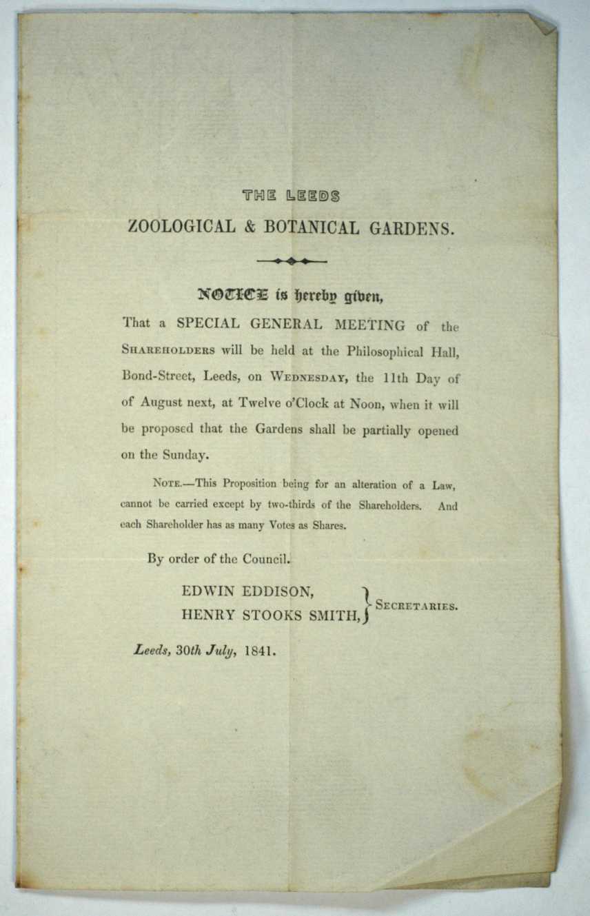 A copy of the agenda for a special general meeting of the shareholders of the Leeds Zoological and Botanical Gardens from 1841. Part of the Leeds Museums and Galleries collection.