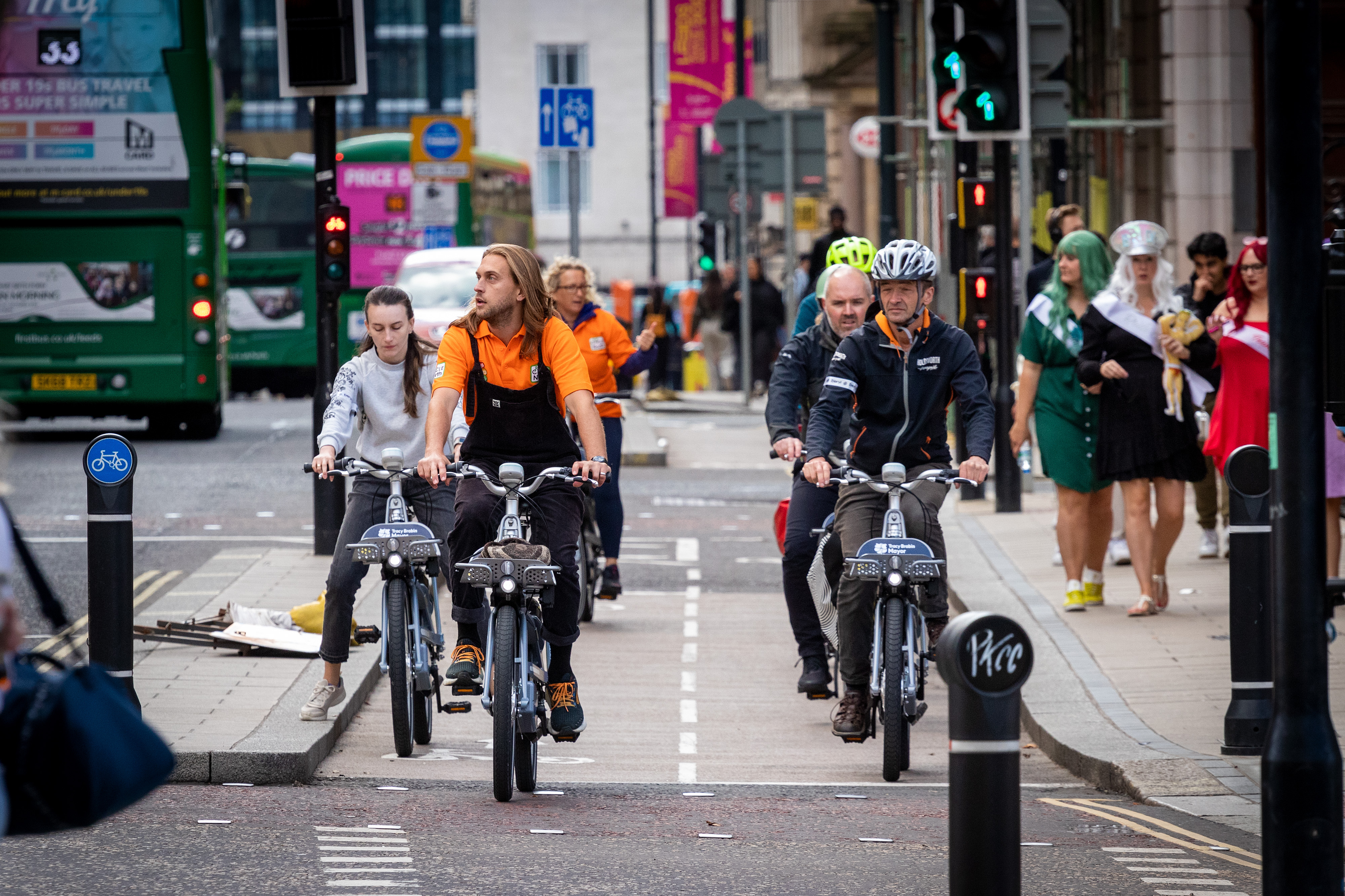 A Cycle North ride leader is leading a group of riders along cycling infrastructure in Leeds during a led ride at the Leeds City Bikes launch event.