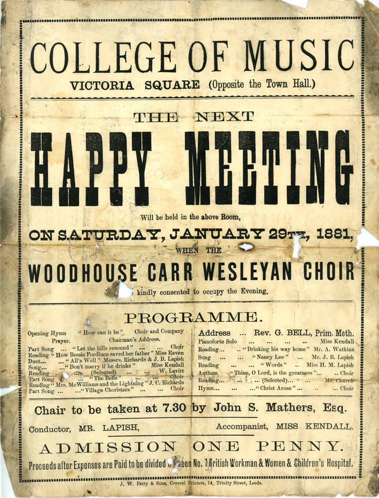 Poster for Happy Meeting concert with Woodhouse Carr Wesleyan Choir, 1881.
